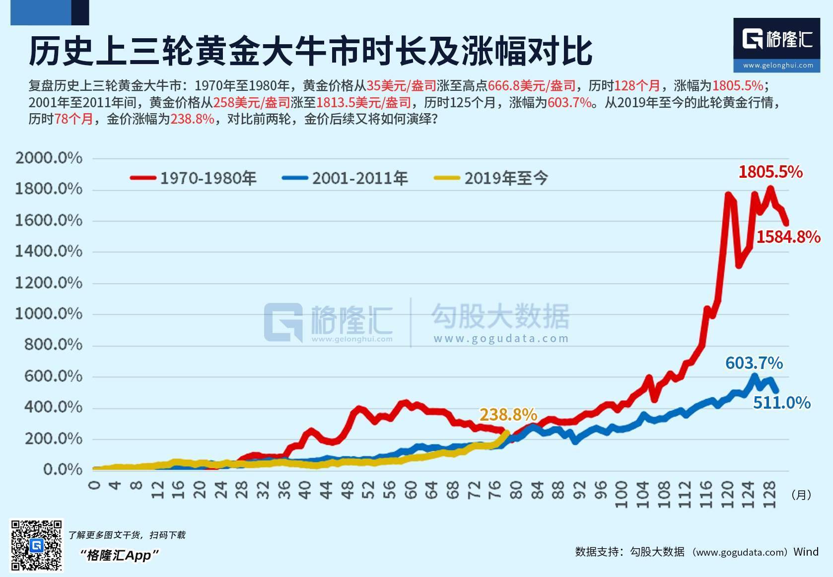 (责任编辑:宋政 HN002) 【免责声明】本文仅代表作者本人观点,与和讯网无关。和讯网站对文中陈述、观点判断保持中立,不对所包含内容的准确性、可靠性或完整性提供任何明示或暗示的保证。请 读者仅作参考,并请自行承担全部责任。邮箱:news_center@staff.hexun.com 2001年至2011年,黄金价格从258美元/盎司涨至1813.5美元/盎司,历时125个月,涨幅为603.7%; 2019年至今的此轮黄金行情历时78个月,金价涨幅为238.8%。对比前两轮,金价后续又将如何演绎? 格隆汇10月17日|复盘历史上三轮黄金大牛市: 1970年至1980年,黄金价格从35美元/盎司涨至高点666.8美元/盎司,历时128个月,涨幅为1805.5%; ...
