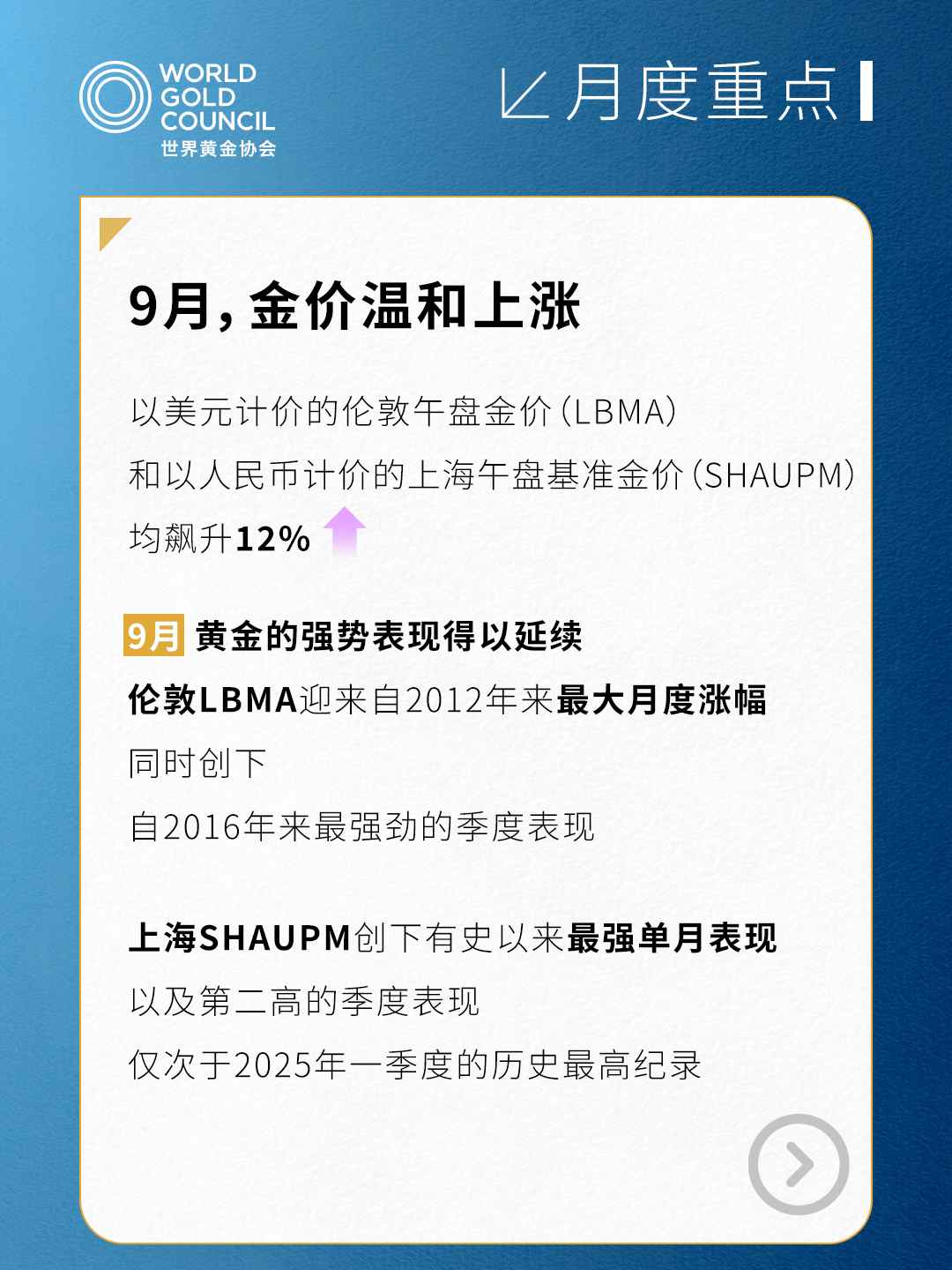 智通财经APP获悉,世界黄金协会10月24日发文称,9月,以人民币计价的上海午盘基准金价(SHAUPM)创下有史以来最强单月表现以及第二高的季度表 现,仅次于2025年一季度的历史最高纪录。中国市场三季度上游实物黄金需求于9月回暖收官。9月,上海实物黄金需求达到118吨,环比反弹33吨,同比 增加4吨。该协会认为回升主要归因于:金价重拾升势以及金饰行业需求略有回暖。 V月度重点 2025年前三季度 上海SHAUPM午盘金价已创下36次历史新高 为有记录以来的最佳年度表现 10月 伦敦LBMA午盘金价 首次突破4,000美元大关 V月度重点 李度 上游实物黄金需求于9月回暖收官 9月,上海实物黄金需求达到 环比反弹33吨 同比增加4吨 我们认为回升主要归因于: 婚庆购买 与相对七八月淡季小幅改善的零售商备货 形成一定支撑 但快速上涨的金价 仍是抑制了其补库热情 ● 金价重拾升势 9月金条与金币的销售情况有所改善 ● 金饰行业需求略有回暖 V月度重点 黄金ETF的净流入部分 扭转了三季度初的流出量 9月 中国市场黄金ETF流入约 9 10 黄金出库量总计达到 同比微降3% = 较十年均值低 37% 金饰需求依旧疲 ...