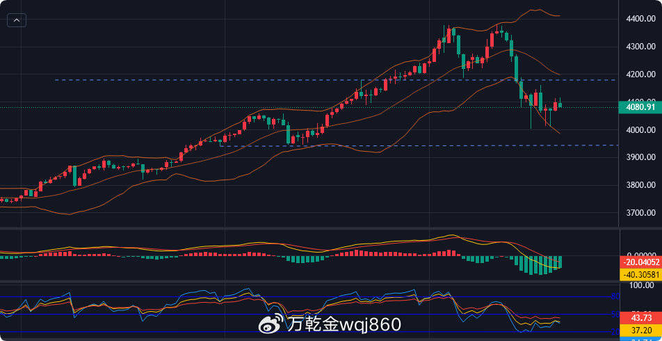 来源:万乾金wqj068 一、黄金消息面因素分析: 操作建议参考:今日先拉升4145-50尝试空,稳健4157-62空,防守4170,下方目标看4065-4055和4030-4020。下方给出4007-13附近准备 多。 文/万乾论金 二、黄金技术面因素分析: 昨日黄金市场呈现探底回升态势:早盘开盘在4126美元/盎司,开盘后直线下跌,一度跌至4004美元/盎司,行情受日线布林中轨支撑触 底反弹,最高触及4161美元/盎司,多空博弈十分激烈。随后金价维持宽幅震荡,最终收报4098美元/盎司。日线收取下影线较长的阴线 形态。 黄金日线级别上,布林带收窄,MACD金叉缩量快粘成一条线,短期涨势暂时受阻。4小时图中,死叉在放量,但同时sto指标已经超卖 勾头,有一定的反攻迹象,多空双方力量处于博弈状态。下方短期关注4005-4000一线支撑,上方短期关注4180-4175一线高点阻力,若 破位多头将再次回归。 周四(10月23日)亚盘,现货黄金价格探底回升。隔日黄金价格下探走低,这是继周二大幅下跌后的延续性抛售压力,短期内获利了结 和技术性调整可能继续对金价构成压力,但美联储降息预期、地缘政治风险以及美国政府停摆带 ...
