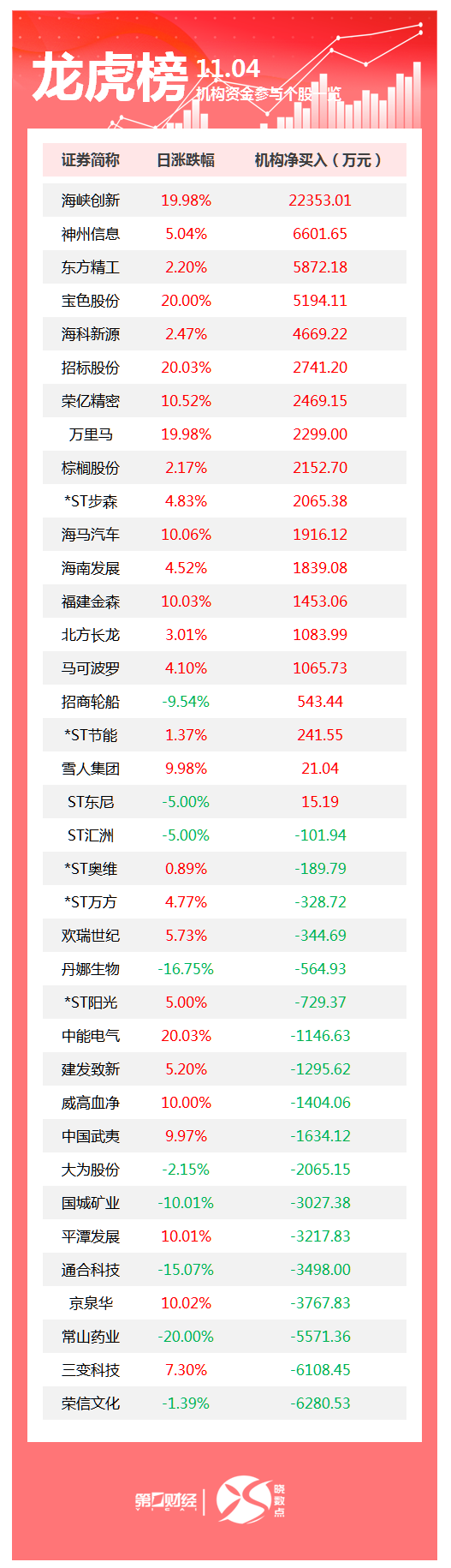 共37只个股出现了机构的身影。 | *ST节能 | 1.37% | 241.55 | | --- | --- | --- | | 雪人集团 | 9.98% | 21.04 | | ST东尼 | -5.00% | 15.19 | | ST汇》 | -5.00% | -101.94 | | *ST奥维 | 0.89% | -189.79 | | *ST万方 | 4.77% | -328.72 | | 欢瑞世纪 | 5.73% | -344.69 | | 丹娜生物 | -16.75% | -564.93 | | *ST阳光 | 5.00% | -729.37 | | 中能电气 | 20.03% | -1146.63 | | 建发致新 | 5.20% | -1295.62 | | 威高血净 | 10.00% | -1404.06 | | 中国武夷 | 9.97% | -1634.12 | | 大为股份 | -2.15% | -2065.15 | | 国城矿业 | -10.01% | -3027.38 | | 平潭发展 | 10.01% | -3217.83 | | 通合科技 | -15.07% | -3498.00 ...