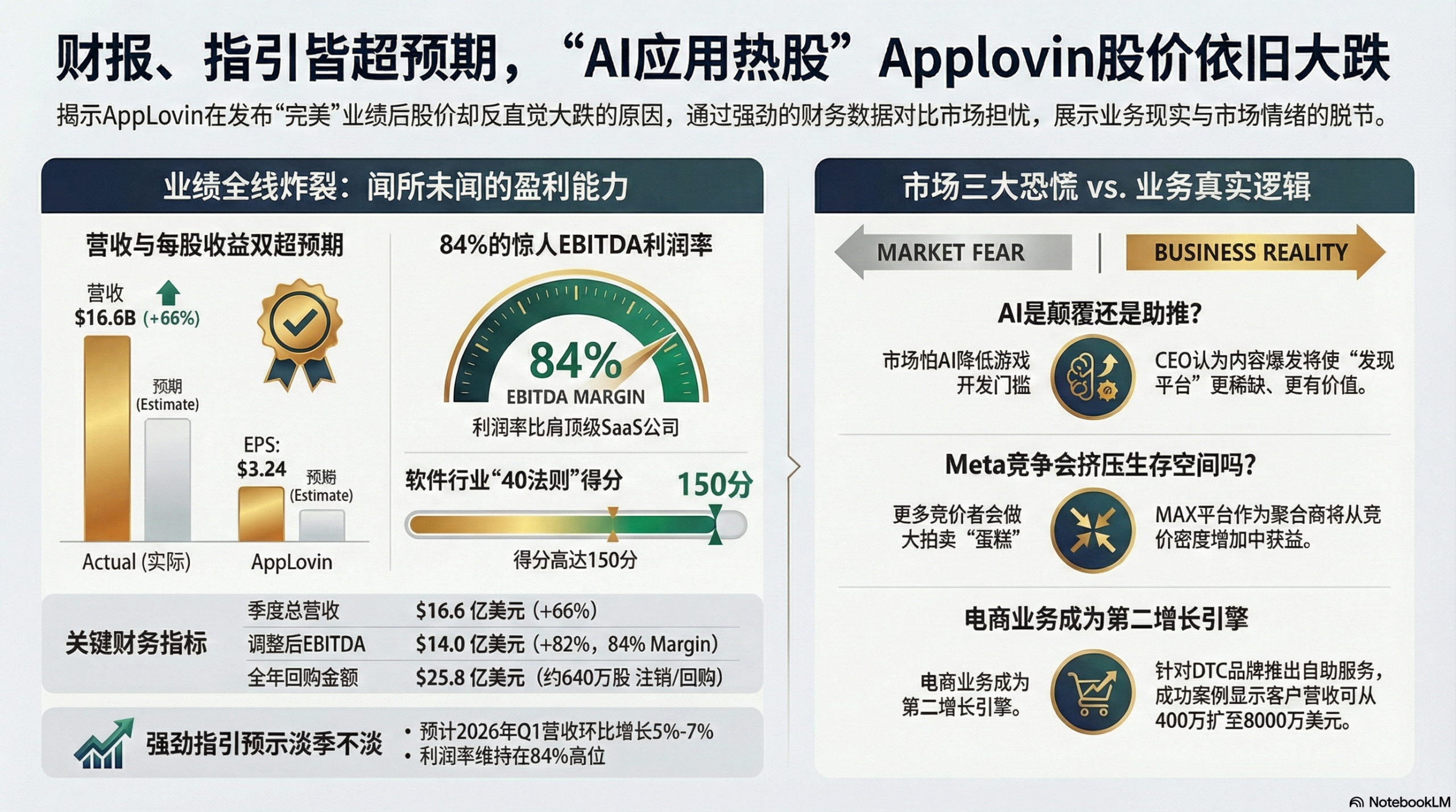 核心观点 - 公司2025年第四季度及全年财务业绩全面超越市场预期,营收、每股收益及调整后EBITDA均实现强劲增长,并给出了2026年第一季度的强劲指引 [2][4] - 尽管业绩亮眼,但市场情绪与公司业务现实存在严重脱节,股价因对AI颠覆游戏开发及巨头竞争的担忧而在盘后大幅下挫 [2][5] - 公司管理层在电话会上直面市场担忧,认为AI和竞争(如Meta)不仅不会威胁其业务,反而是其增长和巩固市场地位的机遇 [5][6][10] 财务业绩表现 - **2025年第四季度业绩**:营收达到16.6亿美元,同比增长66%,高于分析师预期的16亿美元;每股收益为3.24美元,击败华尔街共识预期的2.95美元 [4] - **盈利能力突出**:第四季度调整后EBITDA达到14亿美元,同比增长82%,EBITDA利润率高达84% [4] - **全年业绩**:2025年全年营收达到54.8亿美元,同比增长70%;调整后EBITDA为45.1亿美元,同比增长87%,调整后EBITDA利润率为82% [15] - **现金流强劲**:第四季度自由现金流为13.1亿美元,同比增长88%;全年自由现金流总计39.5亿美元,同比增长91% [14][15] - **股票回购**:2025年全年,公司利用自由现金流回购了约25.8亿美元的股票,截至年底拥有25亿美元现金,并剩余约32.8亿美元的股票回购授权 [6][15] 2026年第一季度及未来展望 - **营收指引**:预计2026年第一季度营收在17.45亿至17.75亿美元之间,意味着在通常的淡季仍将实现5%至7%的环比增长 [4][16] - **利润率指引**:预计2026年第一季度调整后EBITDA利润率将维持在84%的高位 [4][16] - **增长持续性**:公司认为其业务模型(高增长与高利润率结合)非常罕见,并处于平台潜力的早期阶段,将继续为股东提供超额价值 [13][16] 对AI颠覆游戏行业的看法 - **管理层观点**:公司CEO认为AI将大幅降低内容创作成本,导致内容“大爆炸”,从而使“发现”(Discovery)成为稀缺资源 [5][12] - **业务逻辑**:在内容丰富的世界里,能够高效匹配用户与内容的平台将胜出,而这正是公司AI模型(AXON)的设计目标 [5][12] - **反驳看空逻辑**:公司认为AI不会使其生态系统贬值,反而会增强其作为发现和变现平台的价值,其系统跟随用户参与度,AI将增加这种能力 [5][12] 对市场竞争(尤其是Meta)的看法 - **竞价系统逻辑**:公司的MAX聚合平台是一个基于竞价的系统,更多的竞争者(如Meta)会增加竞价密度,从而扩大整个市场的蛋糕,对生态系统有利 [6][11] - **经济效益**:当竞争对手赢得展示时,通常是公司模型估值较低的那一次,这导致发布商赚得更多,而公司也能向中标者收取5%的费用,从而改善经济效益 [6][11] - **护城河与网络效应**:公司的护城河不仅在于聚合技术本身,更在于其结合了市场上最好的广告解决方案和用户获取工具,形成了强大的360度解决方案和网络效应,客户粘性很强 [11][48] 电商及其他新业务拓展 - **电商业务进展**:第四季度推出了电商自助服务平台(目前仅限推荐),现有客户的支出出现“实质性增长” [6][17] - **成功案例**:一家以色列炊具公司通过其平台将营收从400万美元扩大至1600万美元,并预计今年将达到8000万美元 [7][37] - **业务定位**:公司专注于服务基于交易的中小企业(如DTC品牌、Shopify商家),帮助其成长,而非通过代理机构购买的大品牌 [38][83] - **其他领域**:除电商外,公司也在拓展其他基于交易的业务类别(如金融科技),并计划未来进军潜在客户生成(Lead-gen)业务 [38][106] 技术、模型与产品发展 - **AXON模型优势**:公司的AXON2模型是游戏用户获取领域的重大突破,使其取得了市场领先地位,模型通过闭环数据不断自我强化 [57][63] - **电商模型对比**:电商模型尚处于更早期阶段,数据渗透率远低于游戏模型,但已显示出竞争力,随着更多客户加入和数据积累,模型改进潜力巨大 [73][101] - **生成式AI工具应用**:公司正在试点使用生成式AI工具为广告商自动创建互动页面和视频广告,以降低创意素材成本,提高客户成功率和广告数量 [20][21] - **新产品推出**:第四季度推出了“潜在客户开发”产品,允许广告商上传历史购买数据以寻找新客户,并已看到快速采用和积极效果 [64][65] 营销与增长策略 - **效果营销测试**:公司正在小规模测试通过社交和搜索广告来获取电商广告商,初步数据显示在第30天生命周期价值与获客成本已实现盈亏平衡,回报表现优异 [28][29] - **增长驱动力**:公司认为当前增长主要由需求侧驱动,通过改进核心模型和增加广告商多样性(如电商)来提高整体转化率,仍有巨大增长空间 [80][96] - **供应侧**:MAX市场本身增长非常快,公司认为无需依赖争取新发行商来驱动增长,现有市场已足够大 [72][96]