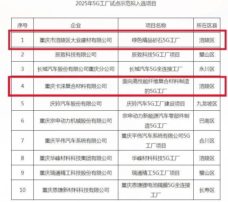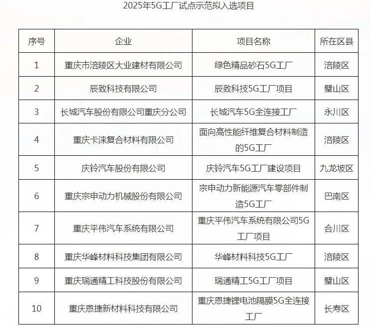 项目公示与入选企业 - 重庆市经济信息委于10月27日公示本年度一批市级5G工厂及工业互联网试点项目 [1] - 涪陵区大业建材有限公司的绿色精品砂石工厂和重庆卡涞复合材料有限公司的面向高性能纤维复合材料制造的5G工厂上榜2025年5G工厂试点示范拟入选项目 [1] - 公示名单共包含10家企业项目 覆盖涪陵区 浩陵区 露山区 永川区 九龙坡区 四南区 合川区 璧山区 长寿区等多个区县 [2] 项目名单详情 - 入选企业包括重庆市涪陵区大业建材有限公司 辰致科技有限公司 长城汽车股份有限公司重庆分公司等10家公司 [2] - 项目名称涵盖绿色精品砂石5G工厂 辰致科技5G工厂项目 长城汽车5G全连接工厂等 [2] - 重庆卡涞复合材料有限公司 庆铃汽车股份有限公司 重庆宗申动力机械股份有限公司等企业项目均位列名单中 [2] 政策背景与发展规划 - 5G与工业互联网相辅相成 共同加速重庆市制造业智改数转进程 [3] - 发展依据为今年8月印发的《重庆市加快推动"5G+工业互联网"升级发展实施方案》 [3] - 计划到2027年再新建30个市级5G工厂 以深化5G+工业互联网高质量发展和规模化应用 [3]