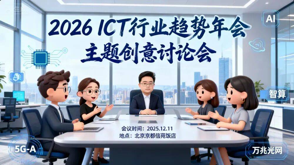 北京京都信苑饭店 家人们!备受关注、一年一度的2026 ICT行业趋势年会终于定档啦! 工信智媒体总编"刘皇叔"带着编辑部小伙伴们头脑风暴完,就马不停蹄跟大家同步: 2025年12月11日 咱们一起唠唠ICT行业新趋势! 2026 ICT风向在哪?编辑部先开脑洞! 主题创意会热热闹闹,大家金句和灵感不停冒,AI、智算、5G-A、融合这些热门词,成了核心创意点。 配图由即梦AI与豆包AI生成 编辑小孟(AI派) 从技术突破到实际应用,从单个创新到整个生态,小伙伴们畅所欲言,各有各的想法,每个创意都说到了行业关键处。 重头戏! 2026 ICT行业趋势年会主题 你说了算! 为心仪主题提案打call投票! 重要的来了! 留言区甩出自创主题 "最热的话题非AI莫属,AI重构产业,必须C位……" 编辑小申(融合派) "智能如潮水般涌现,融合才是关键,技术跟产业、场景捏合到一起才能实现跃升……" 编辑小沈(技术派) "既然是ICT行业趋势年会,5G-A和光网必不可少,技术融合赋能产业升级……" ...