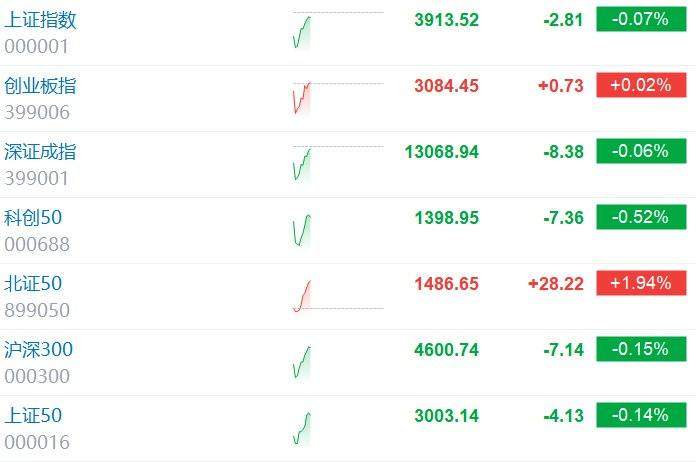市场整体表现 - A股主要指数呈现探底回升走势,创业板指由跌转涨,盘初一度下跌超过1% [1] - 上证指数收报3913.52点,下跌2.81点,跌幅为0.07% [2] - 深证成指收报13068.94点,下跌8.38点,跌幅为0.06% [2] 主要指数涨跌详情 - 创业板指收报3084.45点,上涨0.73点,涨幅为0.02% [2] - 科创50指数收报1398.95点,下跌7.36点,跌幅为0.52% [2] - 北证50指数表现突出,收报1486.65点,上涨28.22点,涨幅达1.94% [2] 大盘蓝筹指数表现 - 沪深300指数收报4600.74点,下跌7.14点,跌幅为0.15% [2] - 上证50指数收报3003.14点,下跌4.13点,跌幅为0.14% [2]