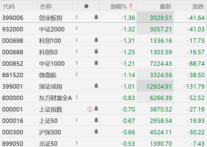 | 代码 | 名称 | | | 涨幅%↑ | 景新 | 涨跌 | | --- | --- | --- | --- | --- | --- | --- | | 399006 | 创业板指 | 1 | ■ | -1.36 | 3029.51 | -41.64 | | 932000 | 中证2000 | 1 | | -1.32 | 3057.21 | -41.03 | | 000698 | 科创100 | 中 | क | -1.31 | 1336.16 | -17.73 | | 000688 | 科创20 | 年 | 車 | -1.25 | 1303.59 | -16.57 | | 000852 | 中证1000 | 1 | 章 | -1.21 | 7224.43 | -88.74 | | 861520 | 微盘股 | 1 | | -1.14 | 3324.56 | -38.50 | | 399001 | 深证成指 | | 0 | -1.01 | 12924.91 | -131.79 | | 800000 | 东方财富全A $ | | | -0.83 | 6266.39 | -52.52 | | 000001 | ...
