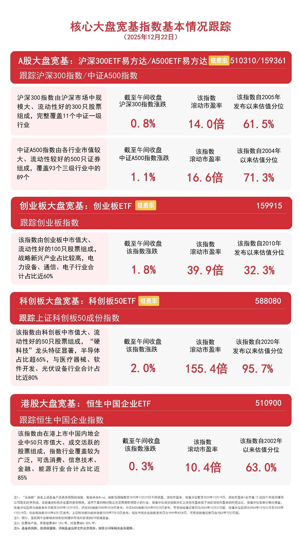| 港股大盘宽基: 恒生中国企业ETF | | | 510900 | | --- | --- | --- | --- | | 跟踪恒生中国企业指数 | | | | | 该指数由在港上市中国内地企 | | | | | 业中50只市值大、成交活跃的 | 截至午间收盘 | 该指数 | 该指数自2002年 | | 股票组成,指数行业覆盖较为 | 该指数涨跌 | 滚动市盈率 | 以来估值分位 | | 广泛,可选消费、信息技术、 | | | | | 金融、能源行业合计占比近 | 0. 3% | 10. 4倍 | 63. 0% | | 85% | | | | 今日早盘,A股三大指数集体走强,沪指涨0.64%再次站上3900点,全市场近3500只个股飘红。板块题材上,海南、存储芯片、贵金属板块活跃,医药商 业、影视院线板块调整;港股表现分化,半导体概念股领涨,汽车、机器人、软件等板块涨幅居前,医药、高股息板块走弱。截至午间收盘,中证A500指 数上涨1.1%,沪深300指数上涨0.8%,创业板指数上涨1.8%,上证科创板50成份指数上涨2.0%,恒生中国企业指数上涨0.3%。 | 科创板大盘宽基:科创板50ETF 低费率 | ...