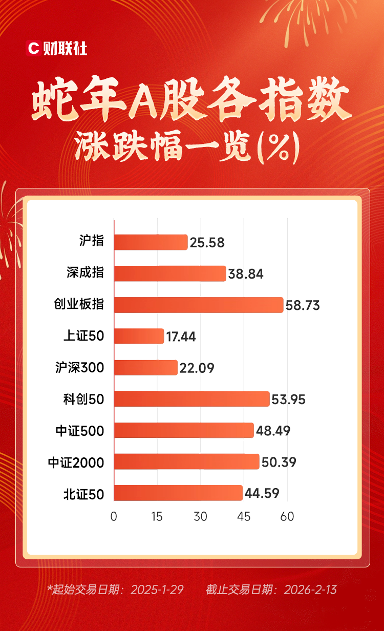 A股蛇年行情圆满收官:创业板指蛇年收涨近60%