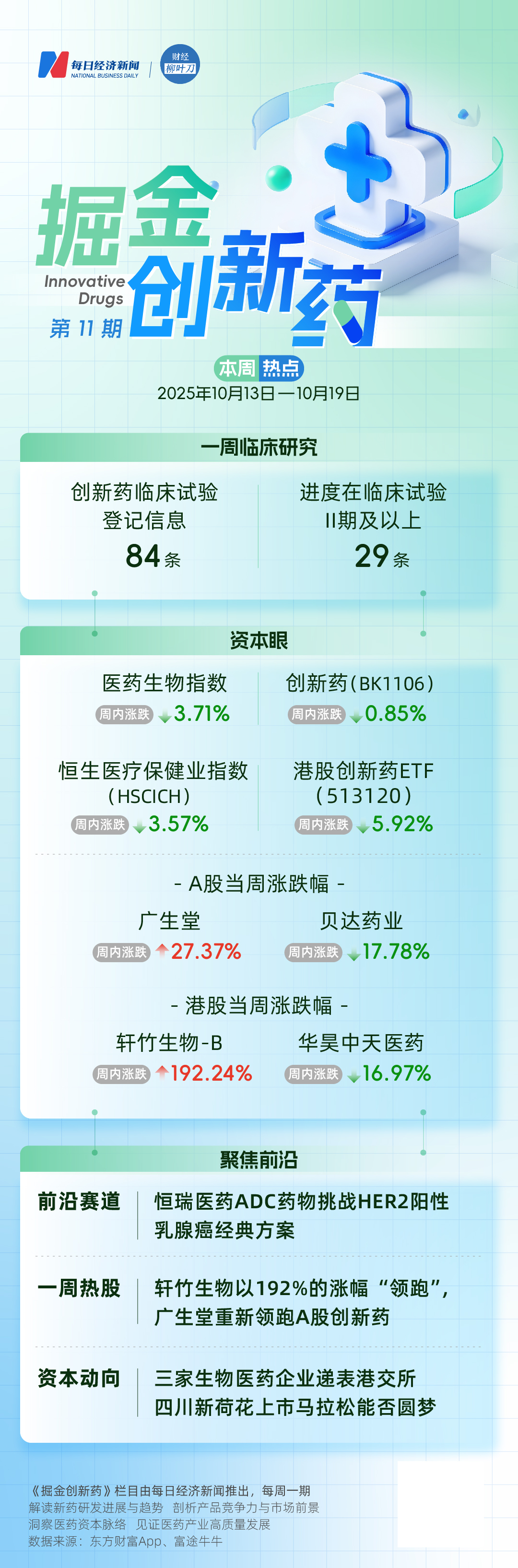 每经记者|金喆 每经编辑|魏官红 | 101 8807 1 - 2 4 1 1 - 2 4 | | --- | | 洞察医药资本脉络 见证医药产业高质量发展 | | 数据来源:东方财富App、富途牛牛 | 资本眼 一周行情 10月13日至10月17日,医药生物指数下跌3.71%,跑输上证指数1.76个百分点,已连续四周跑输上证指数。创新药(BK1106)周内下跌0.85%,也已连续四 周下跌。恒生医疗保健业指数(HSCICH)周内下跌3.57%,虽同比下跌幅度收窄,但下行趋势明显,部分个股回到半年前的行情;港股创新药ETF (513120)周内下跌5.92%,创6月20日后最大单周跌幅。 一周IPO动向 三家生物医药企业递表港交所,四川新荷花上市马拉松能否圆梦 根据港交所披露,四川新荷花中药饮片股份有限公司(以下简称四川新荷花)、安徽华恒生物科技股份有限公司、武汉滨会生物科技股份有限公司递表。 其中,此次是四川新荷花今年二度递表港交所,这也是创始人江云携家族开启的第五次上市征程。资料显示,四川新荷花成立于2001年,如今已在中药饮片 赛道深耕24年。作为国内头部供应商,其核心业务涵盖毒性饮片与普通饮片的研发、 ...