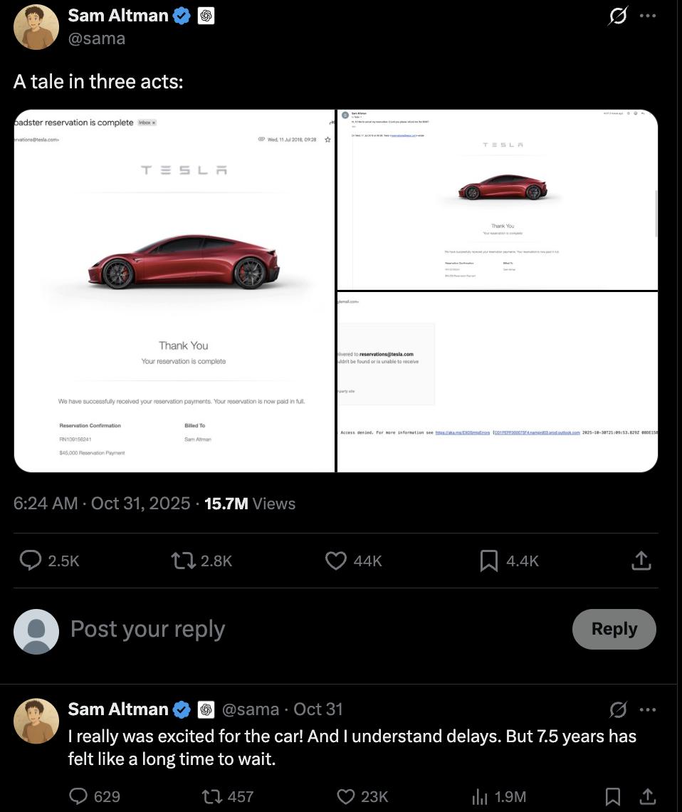 奥特曼和马斯克又在 X 上吵起来了。 前两天,奥特曼在 X 上发了三张图片,并配文「一个分为三幕的故事」。 图片显示,2018 年 7 月,奥特曼支付 4.5 万美元预订了 Tesla Roadster,在等待 7.5 年(从 2018 年到 2025 年 10 月)且 Roadster 仍未交付的情况下,奥特 曼决定取消预订并索要退款。 马斯克、奥特曼「冤家路窄」。 然而,他发现 Tesla 的预订邮箱地址已失效,导致无法处理退款请求。 随后,马斯克回复奥特曼,「你忘了提第四幕,这个问题在第四幕中得到了解决,你在 24 小时内就收到了退款,但这是你的本性」,并旧事重提,指责 奥特曼「你偷了一家非营利组织。」 提起这事儿奥特曼更坐不住了,转发此帖为自己辩护,强调他将 OpenAI 从马斯克离开后「奄奄一息」的状态,转变为如今估值 5000 亿美元的 AI 巨头。 他认为 OpenAI 当前的混合结构是成功的必要条件。 「你还想让特斯拉收购 OpenAI,这根本不是一个非营利组织。你说我们成功率为 0%。现在你拥有一家很棒的人工智能公司,我们也有。我们难道不能 都向前看吗?」奥特曼评论称。 2015 年,马斯克 ...