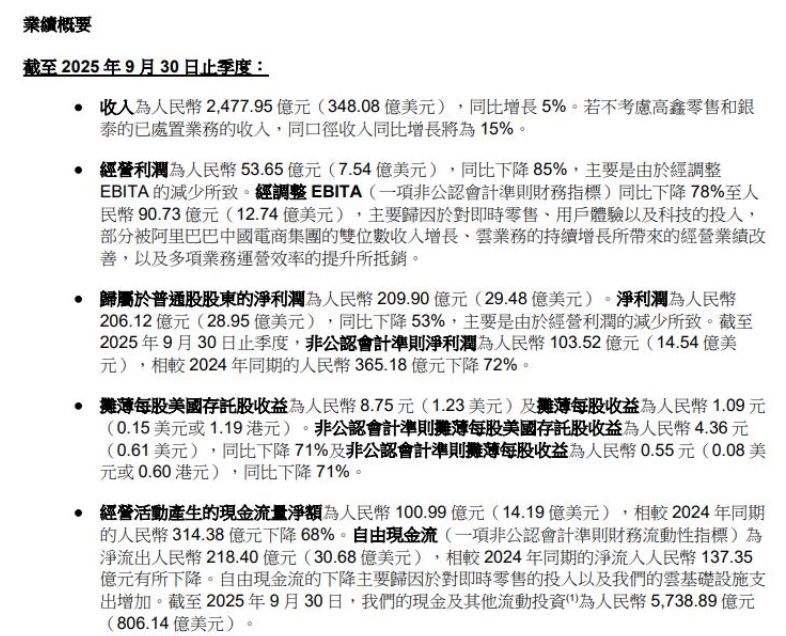 | | | 截至9月30日止三個月 | | | | --- | --- | --- | --- | --- | | | 2024 | 2025 | | | | | 人民幣 | 人民幣 | 美元 | %同比變動 | | | | (以百萬計,百分比及每股數據除外) | | | | 收入 | 236,503 | 247,795 | 34.808 | 5% | | 經營利潤 | 35.246 | 5.365 | 754 | (85)%(2) | | 經營利潤率 | 15% | 2% | | | | 經調整 EBITDA(1) | 47,327 | 17,256 | 2.424 | (64)%(2) | | 經調整 EBITDA 利潤率(1) | 20% | 7% | | | | 經調整 EBITA(1) | 40.561 | 9.073 | 1.274 | (78)%(2) | | 經調整 EBITA 利潤率(1) | 17% | 4% | | | | 淨利潤 | 43.547 | 20.612 | 2.895 | (53)%(2) | | 歸屬於普通股股東的淨利潤 | 43.874 | 20.990 | 2.948 ...