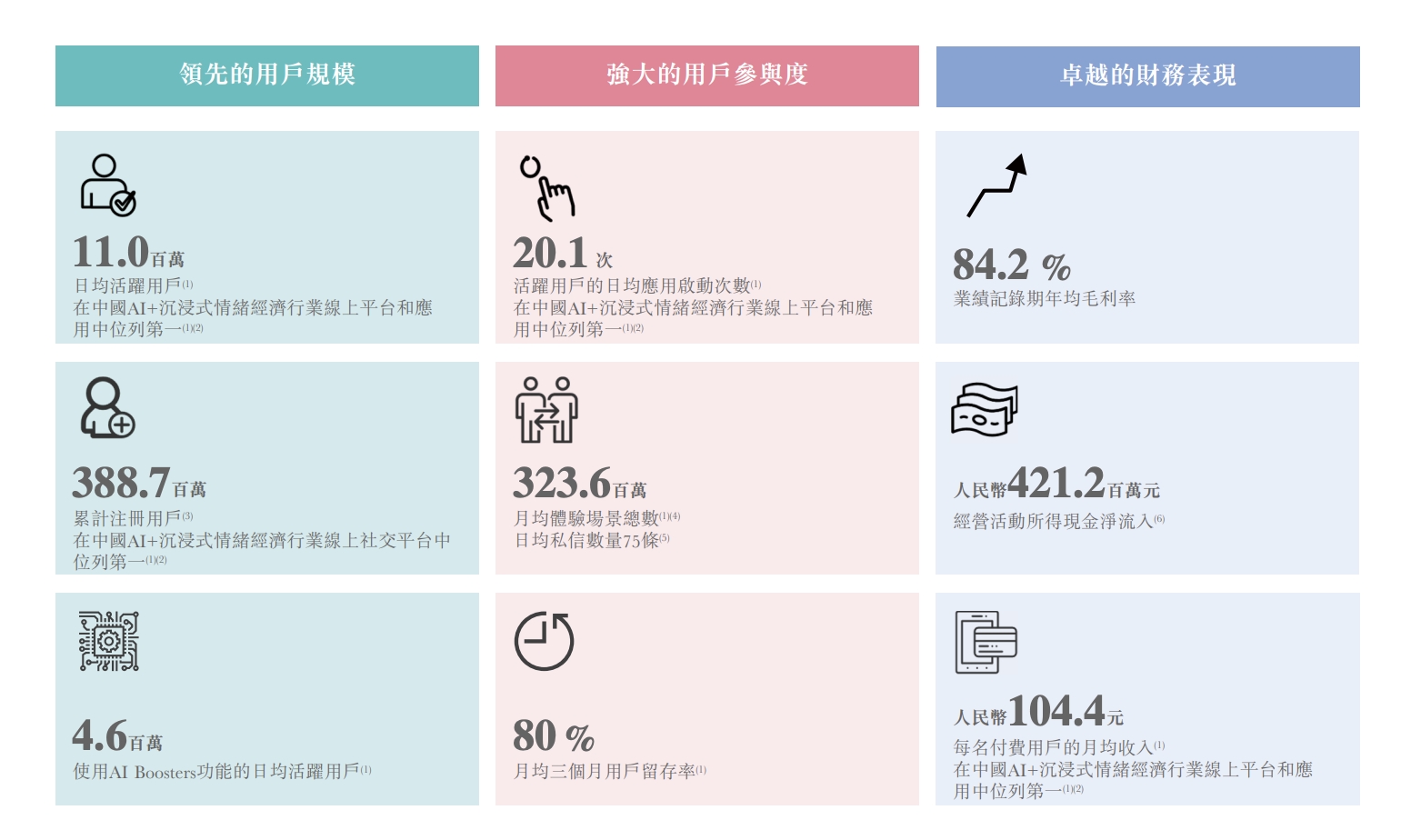 公司上市历程与定位演变 - 公司第四次冲击上市,此前曾于2021年撤回赴美上市申请,并于2022年、2023年两度递表港交所均告失效 [1] - 公司定位从早期的“社交元宇宙”转变为最新的“AI+沉浸式社交平台” [1] 业务模式与收入结构 - 公司最主要的收入来源是AI提供的情绪价值服务,该服务收入占总收入的90.8% [1][4] - 收入结构主要包括情绪价值服务和广告两部分,其中情绪价值服务自2022年以来一直保持在总收入约90%的水平 [4] - 2025年前8个月,公司总营收为16.83亿元人民币,较上年同期的14.28亿元增长17.86% [4] - 公司收入从2020年的4.98亿元增长至2024年的22.11亿元,四年内增长显著 [4] 用户规模与活跃度 - 截至2025年8月31日,公司日均活跃用户数达11.0百万,其中78.7%为Z世代用户 [2] - 平均月活跃用户互动参与比例达到86.0%,人均每日发出点对点私信约75条 [2] - 月均三个月用户留存率达到80% [2] - 公司累计拥有约3.89亿注册用户 [2] - 2025年前8个月,用户日均使用时长超过50分钟,每月在平台上创建或参与超过3.23亿次基于兴趣的活跃“体验”场景 [2] - 根据弗若斯特沙利文报告,公司的平均日活跃用户数、用户平均每日启动次数及新安装用户的30日留存率均在中国AI+沉浸式社交平台中排名第一 [2] 付费用户与财务表现 - 公司每名付费用户的月均收入达到人民币104.4元,在中国AI+沉浸式社交平台中排名第一 [1] - 过去四年,公司月均付费用户数稳定在150-180万之间 [7] - 每名付费用户的月均收入从2020年的43.5元增长至当前的104.4元,提升幅度约140% [7] - 付费用户月均收入在2022年为75.3元,2023年增长至91.7元 [8] - 2023年和2024年,公司的经调整后净利润分别为3.6亿元和3.4亿元人民币 [7] - 2025年前8个月,公司经调整净利润为2.86亿元,同比增幅73% [7] - 2025年前8个月,在16.83亿元总营收中,有近3亿元由“推荐特权+AI相关收入”带来 [7] 技术投入与AI应用 - 公司的情绪价值服务主要通过AI+沉浸式社交网络平台实现,用户付费点在于购买虚拟货币或订阅会员以解锁虚拟物品及特权,例如给AI虚拟伴侣送礼物和打电话 [5] - AI玩法包括“兴趣图谱+AI算法”帮助用户匹配、AI驱动的推荐系统理解用户画像并进行精准匹配,以及AI Boosters协助用户发起对话等 [5] - 2025年前8个月,公司技术及开发开支达到4.07亿元人民币,高于去年同期,占收入的24.2% [6] - 技术及开发开支从2020年的1.87亿元,在2年内迅速涨至2022年的4.72亿元,2024年达到5.46亿元 [6] - 技术及开发人员已占公司雇员总人数的将近一半 [6] - 公司计划继续增加对技术基础设施的投资,包括开发GPU计算平台、增强数据分析能力以及招聘与留住顶尖人才 [6] 行业竞争与市场环境 - 在陌生人社交软件用户普遍付费意愿下降的环境中,公司付费用户数保持稳定 [7] - 2024年第二季度,陌陌付费用户从去年同期的720万腰斩至350万,探探付费用户仅剩70万,同比流失30% [7] - 公司付费比率约为6.5%,呈现低付费率、高每用户平均收入的特点 [10] - 弗若斯特沙利文报告显示,2024年中国AI+沉浸式情绪经济市场规模为70亿元人民币,预计2030年将达到900亿元,期间年复合增长率为52.8% [13]