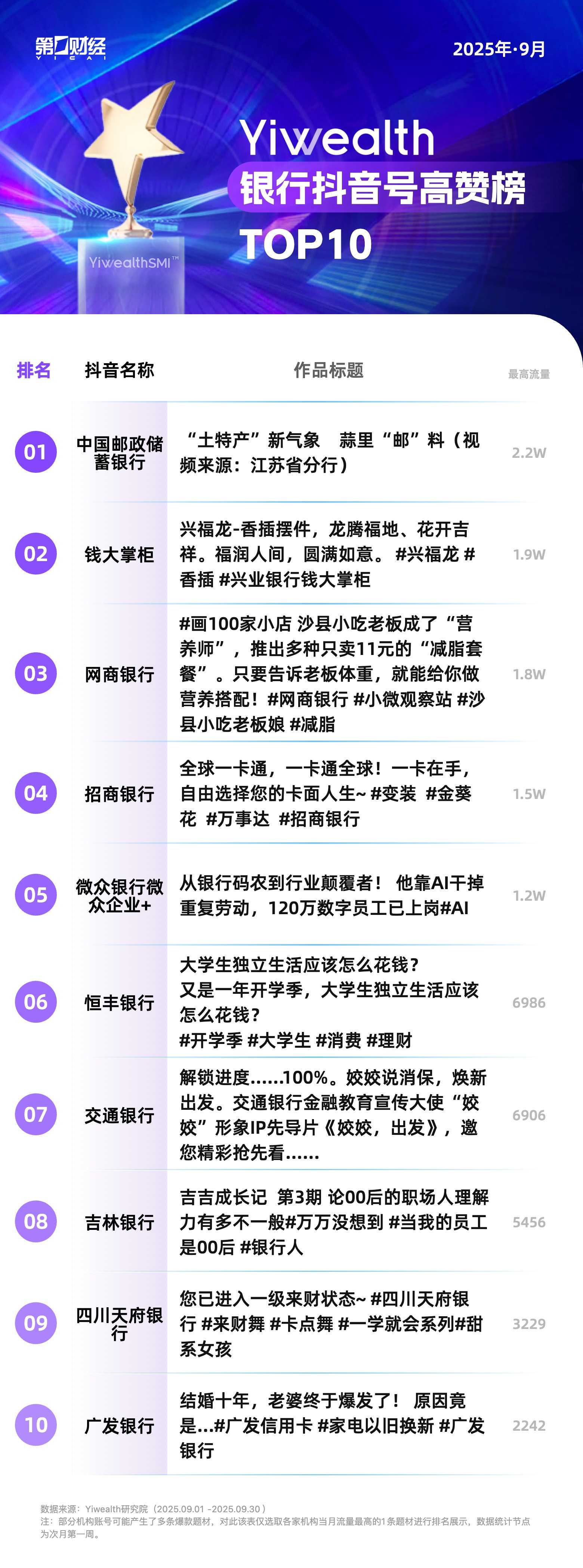 本期为银行社交媒体指数(2025年9月)。 本期为银行社交媒体指数(2025年9月)。 9月,银行SMI总榜TOP3现黑马,兴业银行凭借旗下抖音账号"钱大掌柜"的优异表现以及视频号、公众号的均衡运营,排名从上一期的榜外跃升至TOP2。此 外,还有邮储银行、中信银行、徽商银行新入榜单。 本月抖音高赞榜上榜作品题材百花齐放,包含产品宣传类、品牌宣传、泛财经、投资者教育等各类内容。榜单TOP1作品来自中国邮政储蓄银行的《"土特 产〞新气象蒜里"邮"料》,通过讲述邮储银行在邳州大蒜产业中为蒜农提供的全链条金融支持,如资金精准投放、数字化服务、政策支持等,体现了邮储银 行助力乡村振兴的企业责任担当,收获了2.2万用户点赞。网商银行《画100家小店》系列本期上榜作品讲述了沙县小吃一位老板娘推出平价减脂套餐的故 事,她通过学习营养学知识,结合顾客体重提供个性化营养搭配,推出了每份11元的减脂餐,传统的小吃店通过老板娘敏锐的市场洞察力重新焕发生机,引 发了众多用户点赞。一年一度开学季,恒丰银行结合9月开学题材,发布作品《大学生独立生活应该怎么花钱?》,针对大学生独立生活的消费管理,提出 三大实用经验及"53支配法",干货满满 ...