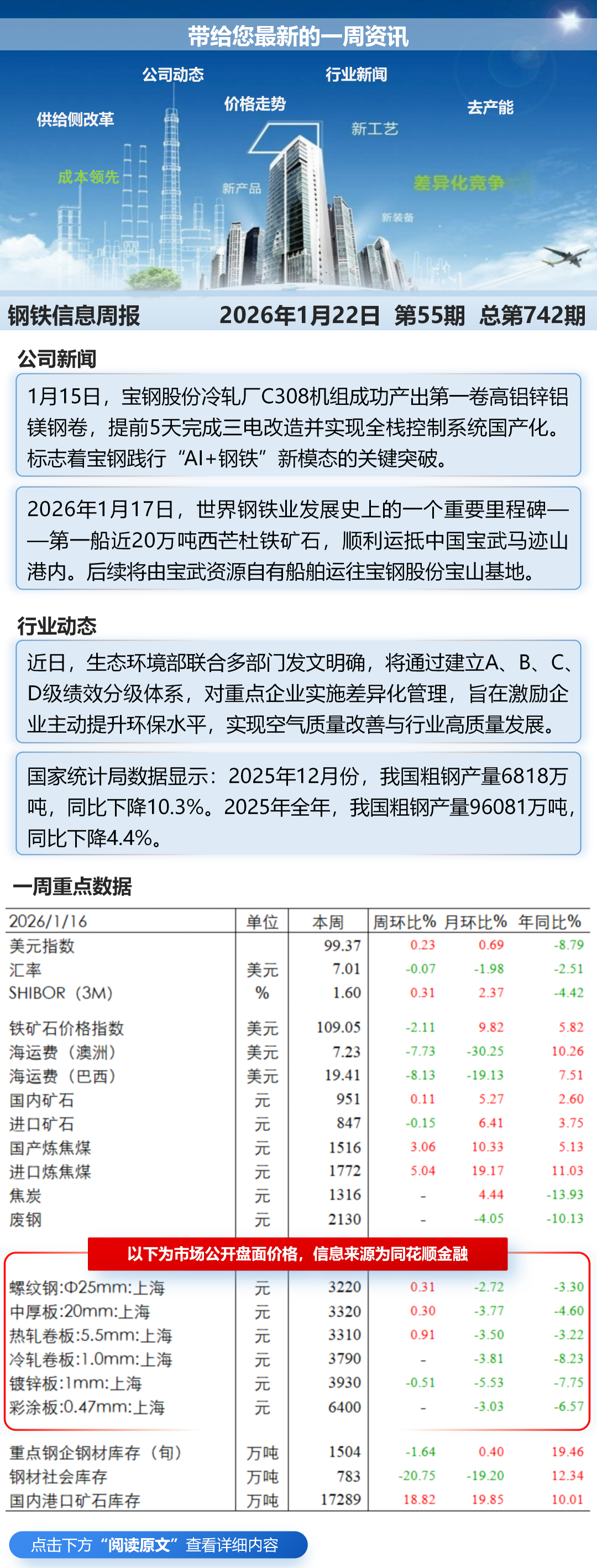 公司新闻 - 宝钢股份冷轧厂C308机组于1月15日成功产出第一卷高铝锌铝镁钢卷,并提前5天完成三电改造,实现了全栈控制系统国产化,这标志着公司在践行“AI+钢铁”新模态上取得关键突破 [3][9] - 2026年1月17日,第一船近20万吨西芒杜铁矿石运抵中国宝武马迹山港,这是世界钢铁业发展史上的一个重要里程碑,后续将由宝武资源自有船舶运往宝钢股份宝山基地 [3][9] 行业动态 - 生态环境部联合多部门发文,明确将通过建立A、B、C、D级绩效分级体系,对重点企业实施差异化管理,旨在激励企业主动提升环保水平,实现空气质量改善与行业高质量发展 [4][10] - 国家统计局数据显示,2025年12月中国粗钢产量为6818万吨,同比下降10.3%,2025年全年粗钢产量为96081万吨,同比下降4.4% [4][10] 宏观与成本数据 - 截至2026年1月16日当周,美元指数为99.37,周环比上涨0.23%,月环比上涨0.69%,但年同比下降8.79% [6][11] - 人民币兑美元汇率为7.01,周环比下跌0.07%,月环比下跌1.98%,年同比下跌2.51% [6][11] - 3个月期SHIBOR为1.60%,周环比上涨0.31%,月环比上涨2.37%,年同比下降4.42% [6][11] - 铁矿石价格指数为109.05美元,周环比下跌2.11%,但月环比上涨9.82%,年同比上涨5.82% [6][11] - 澳洲至中国海运费为7.23美元,周环比下跌7.73%,月环比大幅下跌30.25%,但年同比上涨10.26% [6][13] - 巴西至中国海运费为19.41美元,周环比下跌8.13%,月环比下跌19.13%,年同比上涨7.51% [6][13] - 进口炼焦煤价格为1772元,周环比上涨5.04%,月环比大幅上涨19.17%,年同比上涨11.03% [6][13] - 焦炭价格为1316元,月环比上涨4.44%,但年同比下降13.93% [6][13] - 废钢价格为2130元,月环比下跌4.05%,年同比下跌10.13% [6][13] 钢材价格与库存 - 上海市场螺纹钢(Φ25mm)价格为3220元,周环比微涨0.31%,但月环比下跌2.72%,年同比下跌3.30% [6][13] - 上海市场热轧卷板(5.5mm)价格为3310元,周环比上涨0.91%,但月环比下跌3.50%,年同比下跌3.22% [6][13] - 上海市场冷轧卷板(1.0mm)价格为3790元,月环比下跌3.81%,年同比下跌8.23% [6][13] - 重点钢企钢材库存(旬)为1504万吨,周环比下降1.64%,月环比微增0.40%,但年同比大幅增加19.46% [6][13] - 钢材社会库存为783万吨,周环比大幅下降20.75%,月环比下降19.20%,但年同比增加12.34% [6][13] - 国内港口铁矿石库存为17289万吨,周环比大幅增加18.82%,月环比增加19.85%,年同比增加10.01% [6][13]