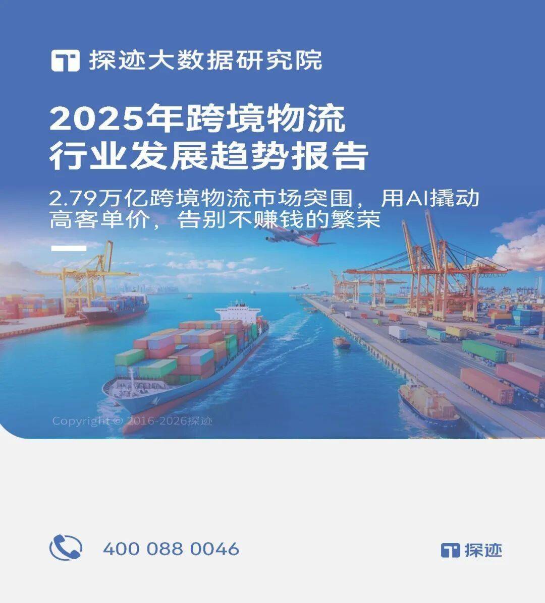 这份由探迹科技发布的《2025 年跨境物流行业发展趋势报告》,核心聚焦行业从 "规模扩张" 转向 "效率与价值竞争" 的转型,强调 AI 与数字化是破局关 键,全文可简单总结为四大模块: 一、行业概览:规模增长但竞争加剧 阿里国际站卖家:北美、南美市场需求突出,广东 + 浙江占比 57.6%,4-5 星高质量卖家增长 33.2%,需针对性开发专线与中小卖家产品。 独立站 / 海外直播店卖家:独立站卖家以欧美高收入市场为主(占比超 85%),单票货值高、毛利高;海外直播店新进入者超 99%,全托管模式占 40%,家居、3C 是 TOP 类目,需弹性供应链支持。 传统外贸卖家:受益 "一带一路",东亚、东南亚贸易增长,海运仍是主流(企业数同比增 94.6%),但空运因高附加值货需求增长 25.7%。 三、核心趋势:六大方向引领行业转型 合规与品牌化:全球合规趋严,亚马逊中国品牌卖家占比超 40%,高性价比商品推动物流模式创新。 市场规模:2025 年跨境物流市场规模预计达 2.79 万亿元,跨境电商规模突破 18 万亿元,增速高于外贸整体,但需应对中美合规收紧(如美国取消 800 美 元以下小包免税)。 企业与区 ...