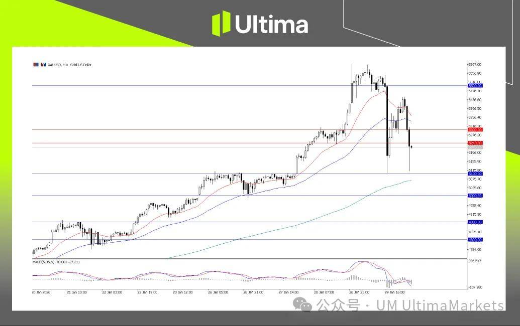 市场整体动态 - 市场经历数周单边上涨后出现大幅回调,由美联储鹰派立场与微软前景指引不及预期引发大规模去杠杆与清算行情[1] - 市场发生风格轮动,资金从估值昂贵的软件与AI股流出,转向价值型板块,道琼斯指数表现相对抗跌[5] 黄金市场 - 黄金价格出现历史级别暴跌,从历史高位5,595美元一度暴跌至5,104美元附近,日内最大回撤近450美元[1] - 此次暴跌主要由大规模获利了结引发,抛物线式上涨趋势被破坏,黄金大概率进入高波动的修正阶段[1][2] - 技术分析显示,黄金短期关键支撑在5,100美元,重要心理关口在5,000美元,强劲阻力位在5,300美元[4] - 黄金后市展望为在5,300至5,000(或5,100)美元区间内震荡修正,收复5,300美元可能重启上行,跌破5,000美元可能引发更深回调[4] - 美联储确认高利率将至少维持至6月,削弱了非孳息资产的低利率支撑逻辑[7] - 金价从5,000美元飙升至5,500美元的行情主要由FOMO推动,动能反转后触发连锁止损抛售[7] 美股与科技股 - 纳斯达克100指数领跌美股,昨日下跌逾1.7%,标普500指数回落约1.0%[1][5] - 下跌由美联储鹰派立场叠加市场对AI的疑虑所触发,AI交易迎来2026年首次重大现实检验[1][5] - 尽管微软财报盈利超预期10%,但市场对其云业务增长放缓及AI资本支出巨大但短期回报有限的担忧引发抛售[5] - Meta因广告与AI收入强劲,股价暴涨+10%[5] - 苹果盘后公布稳健财报,股价隔夜上涨约+1%,短期内缓解了市场对科技股的担忧,有助于纳指企稳[5][6] - 技术分析显示,纳斯达克100指数自接近历史高位回落后,25,800附近构成下一重要支撑,若无法企稳可能引发新一轮抛售,更下方关键支撑区域位于25,000[10][12] 今日市场关注点 - 月末再平衡叠加1月剧烈行情,机构可能在伦敦定盘价与美股收盘前进行大规模调整,尾盘波动或显著放大[12] - 美国12月PPI数据将为通胀趋势提供新观察角度,若数据明显高于或低于预期,可能重新引发市场波动[12]