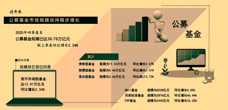 公募基金行业整体规模与业绩 - 截至2025年四季度末,公募基金市场总规模达36.76万亿元,创历史新高,环比增长2.34% [1][3] - 2025年全年,公募基金为投资者实现利润2.6万亿元,刷新历史纪录,行业自1998年以来累计创造利润超7.9万亿元 [1][6] - 2025年四季度,公募基金单季整体亏损1122亿元 [6] 公募基金市场结构 - 货币市场型基金规模最大,达12.01万亿元,环比增长2.34% [3] - 债券型基金规模为11.10万亿元,环比增长3.37% [3] - 股票型基金规模为5.44万亿元,环比增长1.41% [3] - 混合型基金规模为3.66万亿元,环比减少3.72% [3] - QDII基金、另类投资基金、FOF基金规模分别为8228亿元、2876亿元、2442亿元,环比分别增长6.55%、46.44%、26.20% [3] ETF市场发展 - 2025年四季度ETF整体规模突破6万亿元,达6.02万亿元,环比增长约6.93% [1][4] - 股票型ETF规模为3.83万亿元,占比63.68%,其中挂钩沪深300指数的规模最大,为1.19万亿元,环比减少1.18% [4] - 跨境ETF规模为9328亿元,占比15.50% [4] - 债券型ETF规模为8290亿元,占比13.77% [4] - 中证A500指数ETF规模为3009.62亿元,环比大幅增长39.09% [4] 产品数量与发行 - 截至2025年四季度末,公募基金产品总数达13618只,环比增长2.38% [5] - 股票型基金数量3450只,环比增长5.44%,是数量增长最快的类型 [5] - 2025年四季度新发行基金406只,合计募集资金约2801亿元,环比下降约23% [5] - 新发产品中,股票型与债券型基金合计占比75.49% [5] 基金产品与公司盈利表现 - 2025年四季度利润排名前10的基金产品中,有色金属ETF占据7席 [6] - 华安黄金ETF以82.18亿元利润排名第一,博时黄金ETF利润36.37亿元,华夏上证50ETF利润33.88亿元 [6] - 2025年四季度,国投瑞银基金以72.82亿元利润排名第一,华安基金、永赢基金利润分别为65.03亿元、61.81亿元 [7] 公募基金持仓与调仓动向 - 2025年四季度,公募基金持有的A股市值突破7万亿元 [7] - 主动权益类基金前三大重仓股为中际旭创、宁德时代、新易盛,持仓市值分别为825.40亿元、691.75亿元、674.81亿元 [7] - 贵州茅台持仓市值280.31亿元,下降至第7位 [7] - 增持前三的A股为中国平安、东山精密、天华新能,分别增持96.79亿元、69.41亿元、32.84亿元 [8] - 减持前三的A股为亿纬锂能、兆易创新、中际旭创,分别减持44.69亿元、37.64亿元、35.24亿元 [8] - 境外持股前三位为腾讯控股、阿里巴巴—W、中芯国际,持仓市值分别为984.34亿元、652.29亿元、310.56亿元 [8] 行业观点与展望 - 科技板块(尤其是AI产业链)或将受益于国产替代与商业化落地 [8] - 港股科技板块侧重成熟商业模式与现金流,A股科技板块更注重成长性与政策驱动,两者可视为互补组合以实现风险分散 [8]