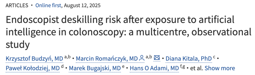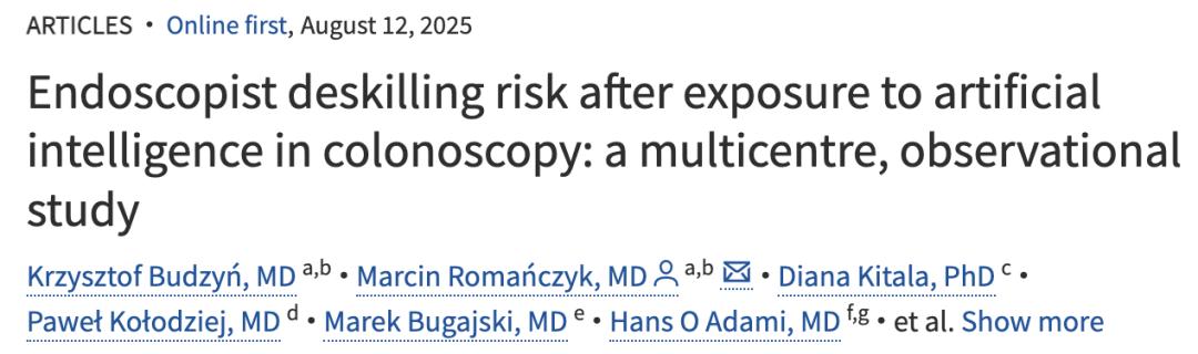 研究核心发现 - AI辅助能提高医生检测结肠癌前病变的准确性[2] - 当撤除AI辅助后,经验丰富的医生病变检测能力暴跌20%[3][21] - 过度依赖AI导致医生自身技能在短短几个月内直线下降[1][6] 研究设计与背景 - 研究由欧洲多家机构合作,成果发表于《柳叶刀·胃肠病学和肝病学》期刊[10] - 研究在波兰四个内镜中心进行,收集2021年9月至2022年3月期间共2177例结肠镜检查数据[11][12] - 所有检查由19名经验丰富的内镜医生执行,每名医生曾做过2000+次结肠镜检查[4][13] 具体数据结果 - 引入AI前三个月,腺瘤检出率为28.4%(226/795例)[19] - 引入AI三个月后,无AI辅助时的腺瘤检出率降至22.4%(145/648例)[20] - 这相当于腺瘤检出率相对下降20%,绝对下降6%[21] 影响机制分析 - 人类天生对AI等决策支持系统存在过度依赖倾向[24] - 无AI辅助时,医生自身的积极性、专注度和责任感减弱[23] - 对AI检测的依赖会钝化人类的模式识别能力,降低诊断信心[28][29] 行业影响与类比 - 此现象被类比为"谷歌地图效应",类似过度依赖导航导致读图能力退化[25][26] - 与自动驾驶领域类似,软件越出色人类越放松,自身能力逐渐退化[39] - 经验丰富医生尚且如此,对实习医生或新手的影响可能更严峻[30]
