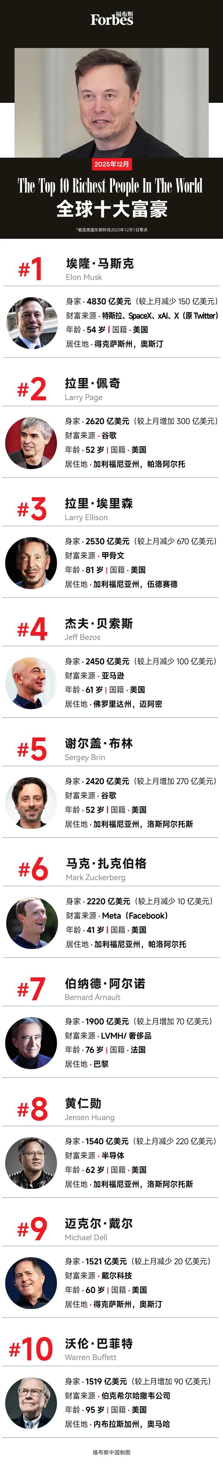 全球富豪排名变动 - 截至2025年12月1日,全球前十大富豪中有七位排名出现变动 [2] - 拉里·佩奇因Alphabet股价上涨14%[1],身家增至2620亿美元[8],排名从第四升至第二[1][3],超越拉里·埃里森和杰夫·贝索斯[3] - 谢尔盖·布林身家增长270亿美元至2420亿美元[1][15],排名上升一位至第五[1] - 沃伦·巴菲特因伯克希尔股价上涨8%且披露近50亿美元Alphabet持股[2],身家增长90亿美元至1520亿美元[30],排名从第11位升至第10位[2] - 拉里·埃里森因甲骨文股价下跌23%[3],财富缩水670亿美元至2530亿美元[11],排名从第二滑落至第三[3] - 史蒂夫·鲍尔默财富下降60亿美元至1490亿美元[2],排名从第9位跌至第11位[2] 富豪财富与公司股价关联 - 拉里·佩奇财富增加300亿美元[8]与Alphabet股价在11月上涨14%直接相关[1] - 谢尔盖·布林财富飙升270亿美元[15]同样得益于Alphabet股价表现[1] - 黄仁勋因英伟达股价下跌13%[3],身家减少220亿美元至1540亿美元[23] - 埃隆·马斯克因特斯拉股价下跌6%[3],财富缩水150亿美元至4830亿美元[8],但仍保持全球首富地位[3][35] - 杰夫·贝索斯财富减少100亿美元至2450亿美元[15] - 马克·扎克伯格财富减少10亿美元至2220亿美元[19] - 伯纳德·阿尔诺财富增加70亿美元至1900亿美元[21] - 迈克尔·戴尔财富减少20亿美元至1521亿美元[26] 全球富豪榜构成 - 全球十大富豪总身家合计为2.4万亿美元,与上月持平 [4] - 十位富豪中九位为美国人,唯一非美国富豪为法国的伯纳德·阿尔诺 [33] - 截至12月1日,全球十大富豪均为男性,最低身家门槛为1520亿美元,低于上月的1550亿美元 [34] - 埃隆·马斯克自2024年5月起持续保持全球首富地位 [31][35]
