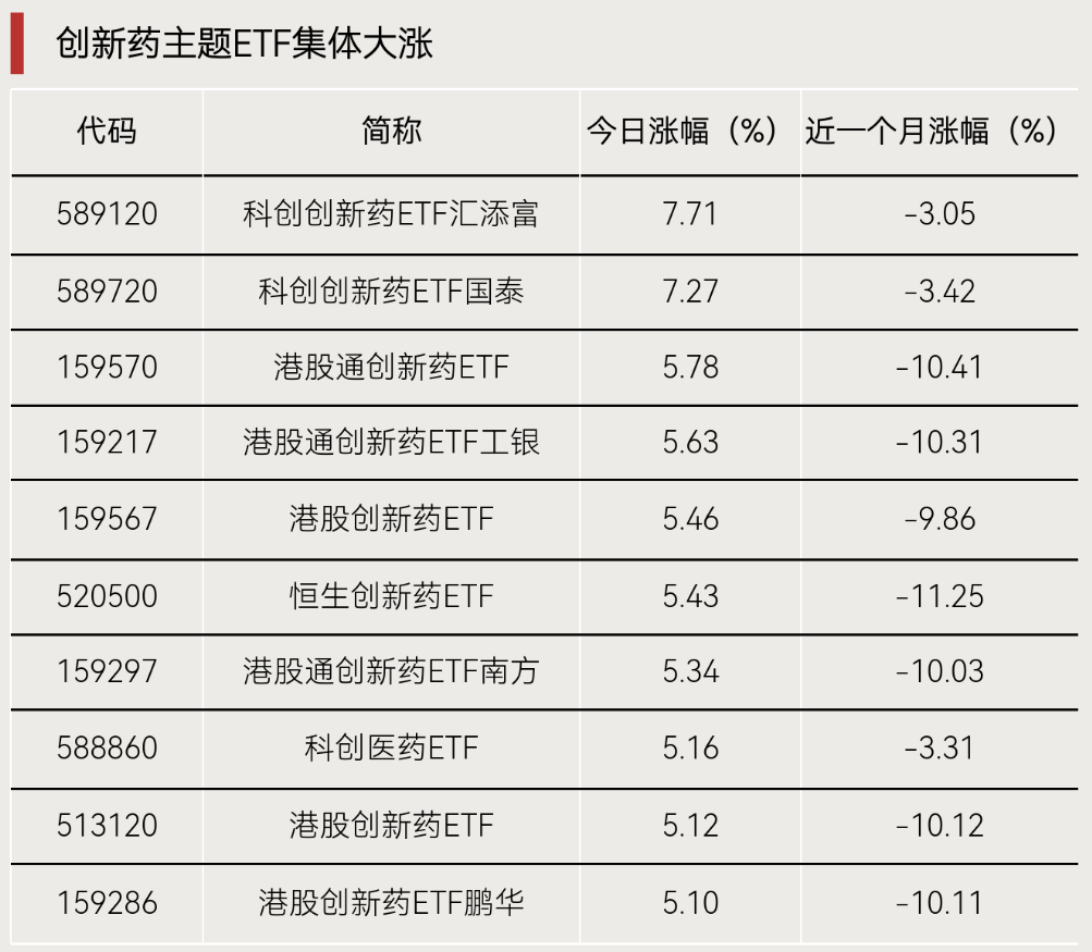 01 10月31日,创新药主题ETF集体大涨,涨幅前十的ETF均是创新药主题ETF,涨幅均超5%;通信设备ETF和通信ETF领跌。 02 10月31日,ETF成交活跃,11只ETF成交额超百亿元,其中包括多只科创债ETF,以及港股创新药ETF等跨境ETF。 03 10月30日,证券ETF、港股创新药ETF、医药ETF、通信ETF等多只行业ETF资金净流入额居前。前一交易日,资金流入较多的则是宽基ETF。 通信设备ETF领跌 10月31日,工业富联(601138)等AI概念股出现调整,通信设备ETF和通信ETF领跌,跌幅均超5%,5GETF、半导体设备ETF易方达、科创芯片 ETF博时等跌幅超4%。 | 代码 | 简称 | | 今日涨幅 (%) 近一个月涨幅 (%) | | --- | --- | --- | --- | | 159583 | 通信设备ETF | -5.34 | -0.46 | | 515880 | 通信ETF | -5.26 | 1.57 | | 159994 | 5GETF | -4.96 | -0.75 | | 159811 | 5G50ETF | -4.93 | -0.23 | | 51 ...