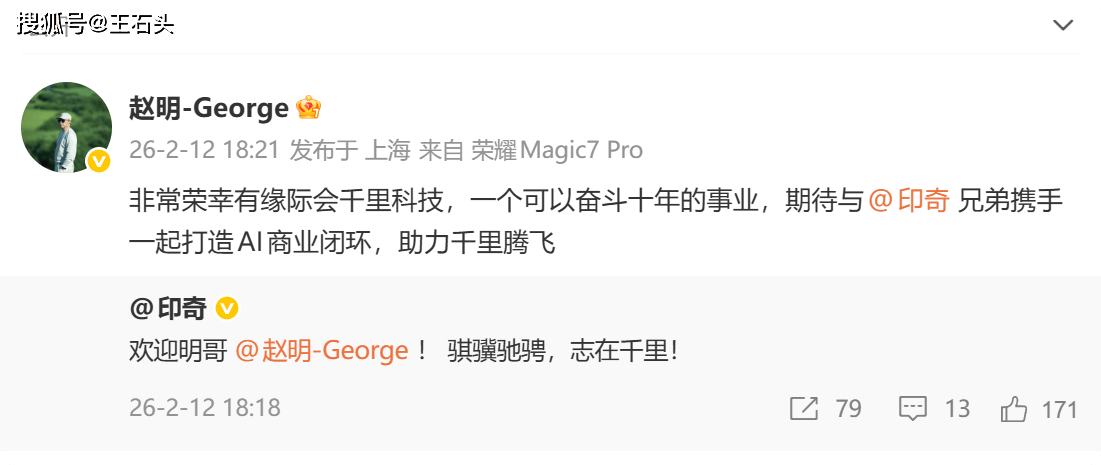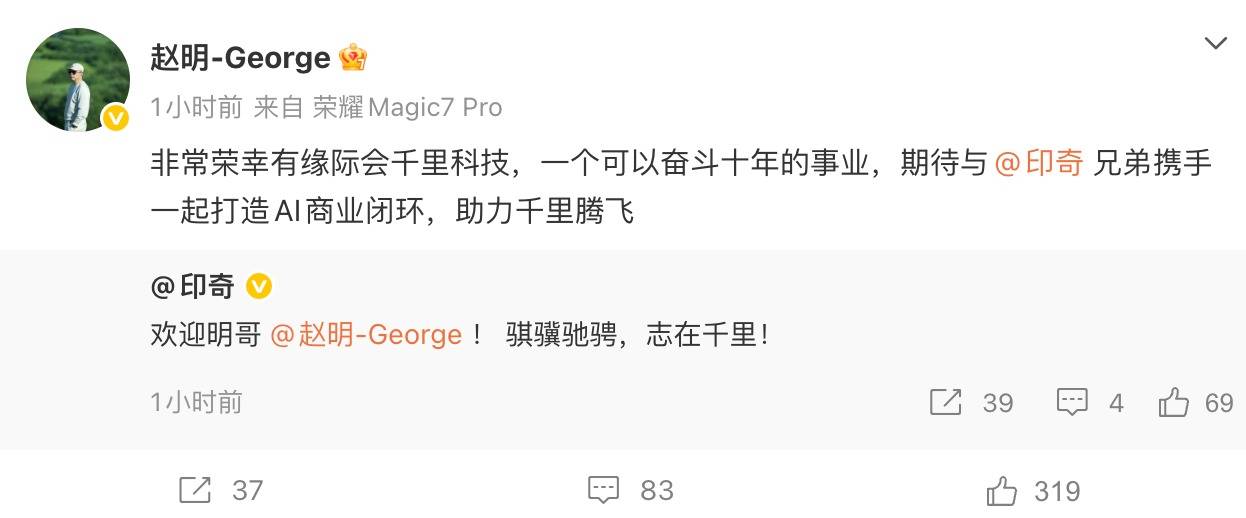 原荣耀CEO赵明官宣加盟千里科技,出任联席董事长携手印奇打造AI商业闭环