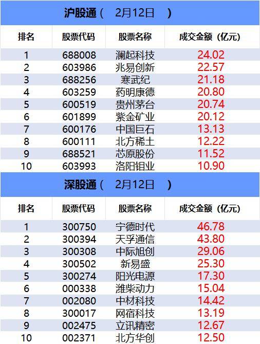 沪深股通成交概况 - 沪深股通今日合计成交2896.59亿元,其中沪股通成交1347.27亿元,深股通成交1549.32亿元 [1][2] - 沪股通成交额排名前三的个股为澜起科技(24.02亿元)、兆易创新(22.57亿元)、寒武纪(21.18亿元)[3] - 深股通成交额排名前三的个股为宁德时代(46.78亿元)、天孚通信(43.80亿元)、中际旭创(29.06亿元)[3][4] 板块资金流向 - 从板块表现看,液冷服务器、小金属、算力硬件等板块涨幅居前,影视院线、旅游酒店、零售等板块跌幅居前 [5] - 主力资金净流入前五的板块为计算机(59.93亿元)、电网设备(56.04亿元)、半导体(54.66亿元)、电新行业(51.22亿元)、电子(46.11亿元)[6][7] - 主力资金净流出前五的板块为医药(-39.01亿元)、食品饮料行业(-25.89亿元)、非银金融(-25.58亿元)、银行(-23.86亿元)、基础化工(-23.48亿元)[7][8] 个股资金监控 - 主力资金净流入前十的个股中,利欧股份以31.98亿元居首,英维克(17.11亿元)和兆易创新(12.93亿元)分列二三位 [9] - 主力资金净流出前十的个股中,新易盛以-14.52亿元居首,光线传媒(-9.53亿元)和胜宏科技(-8.23亿元)分列二三位 [10][11] ETF成交动态 - 成交额前十的ETF中,A500ETF基金(512050)以122.279亿元位居首位,A500ETF华泰柏瑞(563360)以92.405亿元位居次席 [12] - 成交额环比增长前十的ETF中,巴西ETF(159100)以491.25%的环比增长位居首位,当日成交30.7996亿元,现金流ETF(159399)以407.19%的环比增长位居次席 [13] 龙虎榜机构动向 - 机构买入方面,液冷服务器概念股英维克涨停,获四家机构买入3.2亿元,算力硬件概念股特发信息获三家机构买入1.5亿元 [15] - 机构卖出方面,Sedan ce概念股捷成股份遭两家机构卖出1.49亿元 [16] 龙虎榜游资与量化资金动向 - 一线游资活跃度较高,AI应用端个股利欧股份午后直线涨停,获两家一线游资(中泰证券湖北分公司、国泰海通证券三亚迎宾路)合计买入5.6亿元,同时深股通买入2.98亿元 [18] - 量化资金活跃度一般,算力租赁概念股首都在线涨停,获两家量化席位(开源证券西安太华路、华鑫证券上海陆家嘴)合计买入1.7亿元 [20]