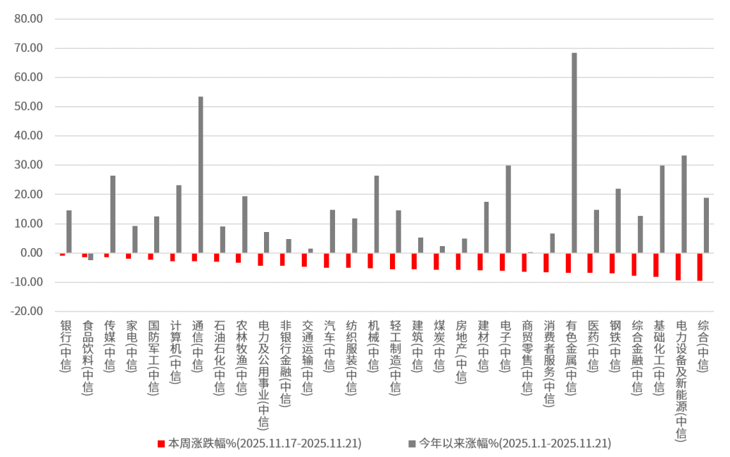 来源:市场投研资讯 (来源:汇丰晋信基金) 本周市场回顾 本周A股市场呈现调整趋势,本周上证指数累计跌幅3.90%,深证成指累计跌幅5.13%,创业板指累计跌幅6.15%,微盘股指数表现弱于大盘,显示 小盘股的调整压力更大。内部因素来看,10月工业增加值同比增速回落至4.9%,社零增速降至2.9%,房地产持续回调,拖累市场信心;外部因素上 看,地缘政治风险、美联储鹰派表态、美股的震荡调整,也对A股情绪形成扰动。 表一:本周各指数涨跌幅 数据来源:Wind,截至2025.11.21。过往表现不预示未来,市场有风险,投资需谨慎。 本周银行板块防御性凸显 近期国内外大厂相继发布AI应用端的重大进展,某电子商务龙头公司推出"千问"app,全面对标ChatGPT,并迅速冲入苹果免费榜前四;同时, OpenAI发布下一代视频生成模型Sora2,以AI营销、AI智能体为首的 AI应用端全线爆发,逆势走强。 *文中所示公司仅作示意,不构成投资建议,市场有风险,投资需谨慎。 11月19日,广期所碳酸锂主力合约自2024年6月以来首次突破10万元/吨关口,锂矿股再获提振,但后半段动力不足,同时前期强势的电解液方向回 落,锂电产业 ...