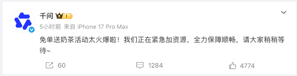 30亿奶茶免单炸场春节!千问冲上App Store免费榜第一,活动页面一度被挤崩!