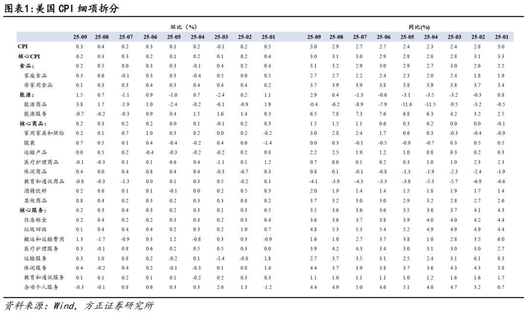 燕翔、石琳(燕翔系方正证券首席经济学家、中国首席经济学家论坛理事) 核心结论 事件: 9月美国CPI同比3%,预期3.1%,前值2.9%;CPI环比0.3%,预期和前值均为0.4%;核心CPI同比3%,预期和前值均为3.1%;核心CPI环比0.2%,预期和前 值均为0.3%。 投资要点: 美国:CPI:季调:同比(%) -- 美国:核心CPI:季调:同比(%) 9 8 7 6 5 4 3 2 l 0 21-08 21-02 22-08 23-08 24-08 25-08 23-02 24-02 25-02 22-02 资料来源: Wind, 方正证券研究所 价格指数:进口商品 =价格指数:国内商品 1.04 1.03 1.02 1.01 1.00 0.99 0.98 0.97 25-04 25-06 25-10 4-12 25-02 25-05 25-08 25-09 24-10 24- 1 1 25-03 25-07 25-01 资料来源: Cavallo,Llamas & Vazquez (2025), 方正证券研究所 美国政府停摆下9月通胀数据发布对市场意义重大,年内美联储大概率降息2次,10年美债利率 ...