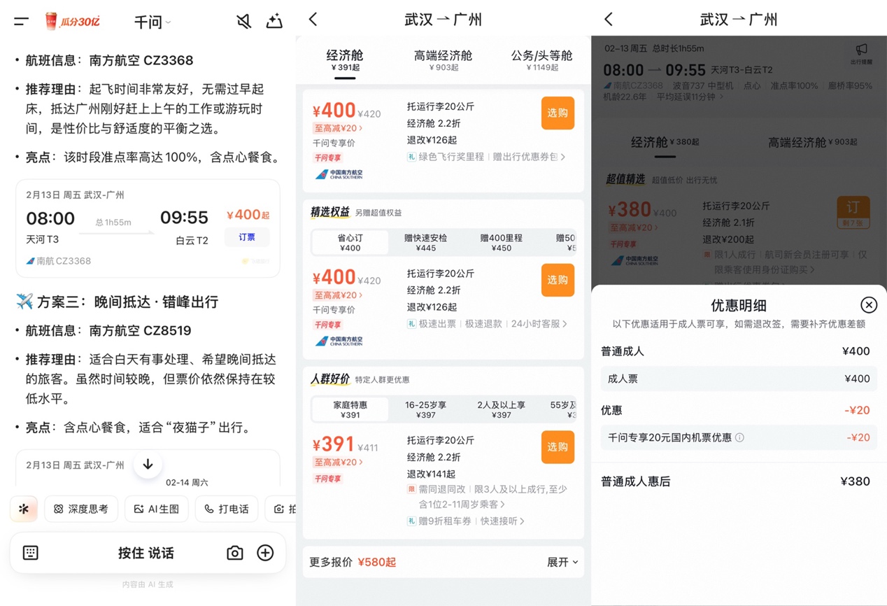 阿里千问AI购物活动与市场表现 - 千问APP在“史上最长春节假期”前夕推出“春节30亿大免单”活动,活动上线仅9小时订单就突破1000万单 [1] - 千问APP持续超越豆包和元宝,蝉联苹果App Store免费榜第一 [1] 阿里生态与航司的AI合作 - 阿里千问、飞猪与中国东方航空达成AI合作,中国东方航空成为首个布局消费级AI的境内航空公司 [1] - 合作将为千问APP和飞猪的AI用户提供专属补贴 [1] - 千问APP已全面接入淘宝、支付宝、飞猪等阿里生态业务,实现AI购物功能 [1] - 用户通过千问APP语音指令(如“帮我订2月12日上海飞厦门的东航机票”)可获得智能航班推荐及标注“千问专享价”的专属优惠,优惠额度为几十元不等 [2] - 未来中国东方航空计划与阿里千问、飞猪进一步深化合作,拓展“机票+”产品及生活服务场景,推动更多互动玩法落地 [2] 行业影响与发展趋势 - 对航空公司而言,与AI平台合作是渠道拓展和航旅服务模式的创新升级,旅客可通过“一句话”享受智能、便捷、优惠的出行体验 [1] - 行业观点认为,2026年是AI消费时代的元年,以阿里千问为代表的AI超级应用正引发消费升级和流量入口切换 [2] - 航司需通过优化供给侧来紧跟需求侧变化,并依托千问、飞猪等AI能力强的平台配置优势政策,以抢占AI流量先机并实现低成本引流 [2] - AI技术有望推动民航业从过去的CRS、GDS、NDC体系进化,进入“AI+”数智营销新时代,通过更个性化的体验满足消费者多元需求 [2]