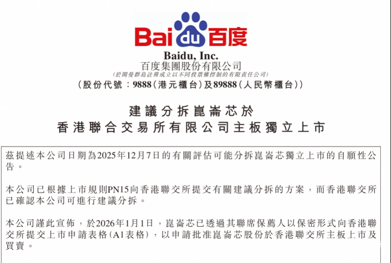分拆完成后,昆仑芯仍是百度附属公司。关于分拆的详情、全球发售的规模与结构、百度在昆仑芯持股减少的幅 度等,尚未落实。 截至发稿时,百度集团港股股价大涨8.67%,报142.9港元,市值3930亿港元。 1月2日,百度发布公告,其附属公司昆仑芯已于1月1日透过其联席保荐人以保密形式向港交所提交上市申请表 格,以申请批准昆仑芯股份于港交所主上市。 百度还公布了昆仑芯的未来五年路线图,百度天池千卡级超节点将于2028年上市,昆仑芯N系列将于2029年上 市,百度百舸百万卡昆仑芯单集群将于2030年点亮。 2025年以来,寒武纪、摩尔线程在市场上受到追捧,摩尔线程更是一举创下科创板年内募资规模与首日打新盈利 的双重纪录。而据媒体报道,昆仑芯2024年营收已经超过10亿元,已经超过了摩尔线程和寒武纪。 采写:南都N视频记者 汪陈晨 对于分拆昆仑芯单独上市的原因,百度在公告中表示,分拆可更全面地反映昆仑芯集团基于自身优势的价值,并 提升其营运及财务透明度;昆仑芯的业务将吸引专注于通用AI计算芯片及相关软硬件系统业务的投资者群体;昆 仑芯的业务凭其规模已足以寻求上市地位。 据了解,昆仑芯源于2012年百度内部芯片项目,于2 ...