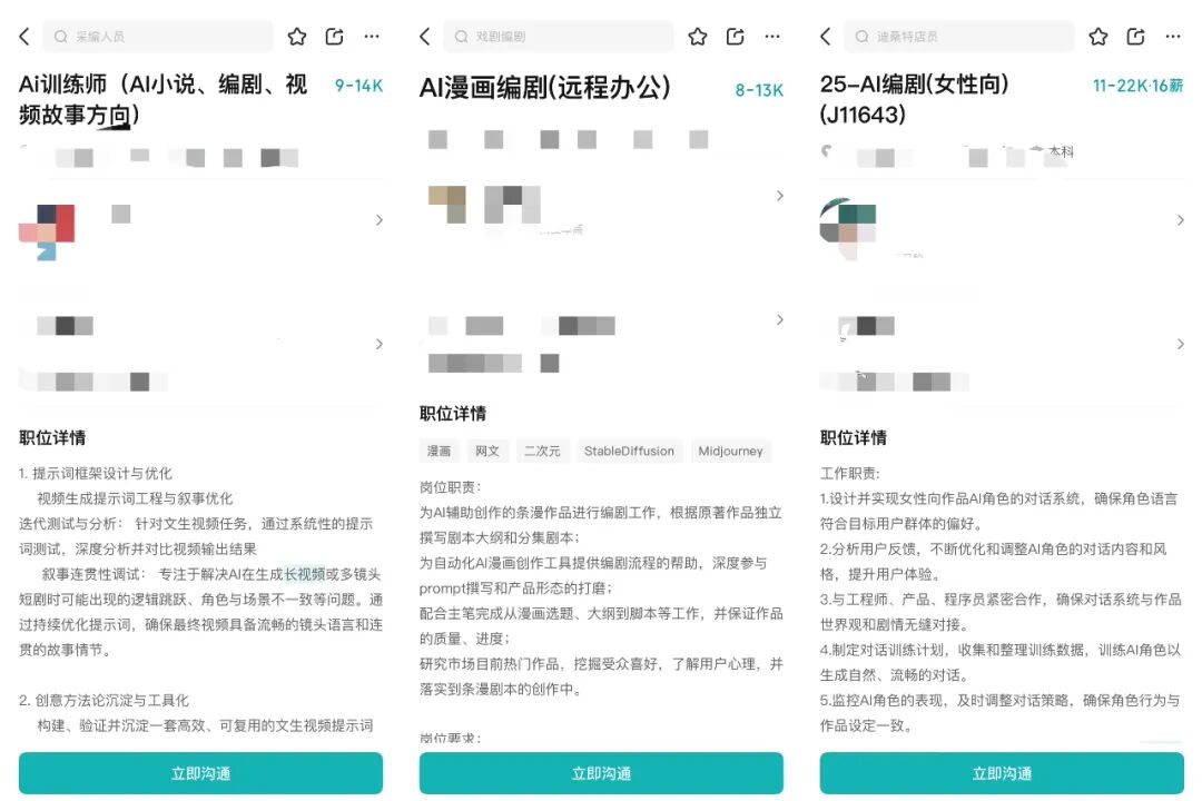 招聘市场上,越来越多的游戏和漫画公司开始增设"AI编辑"岗位,或在对常规岗位的要求中明确列出AI技能。这背后不止是工具的普及,更预示着行业工 作流的深刻变革。 据多位资深从业者透露,AI的应用已超越"辅助"范畴,直接介入世界观与人设的构建,触及了内容创作的创意内核。 这不禁让人思考:AI的深度介入,究竟是在替代人力,还是在重新定义创作的边界?要解释这个问题,关键或许不在于担忧"取代",而在于厘清AI究竟为 创作生态带来了哪些根本性的改变。 | < Q 渠编人员 & G ... | 〈 ○ 戏剧撮剧 G ... | | ( Q 造桑特店员 & G ... | | --- | --- | --- | --- | | Ai训练师(Al小说、编剧、视 9-14K | AI漫画编剧(远程办公) 8-13K | | 25-AI编剧(女性向) 11-22K·16薪 | | 频故事方向) | | | (J11643) 一 一 一 名称 | | | | | | | | 职位详情 | | | | 职位详情 | 漫画 网文 二次元 StableDiffusion | Midjourney | 职位详情 | | 1. 提示词框架设计 ...