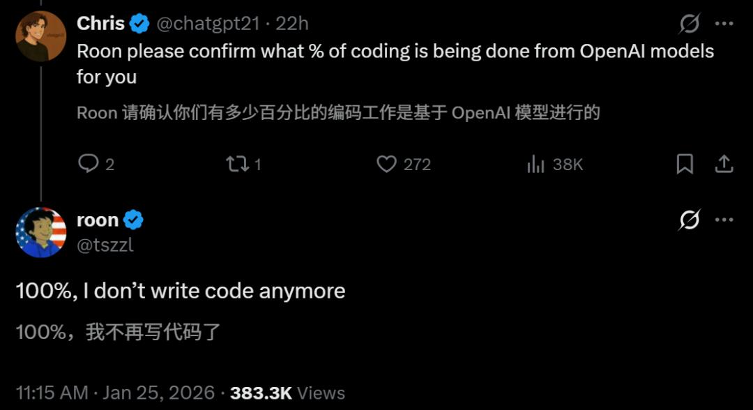 【导读】100%是用Codex写的。还有内部爆料说,Codex让他们仅用三天时间就搭出了服务器,三周就发布了APP。人类程序员,真的要退出历史舞台 了? 硅谷的空气里再次充满了躁动,而这一次的震源中心,回到了OpenAI。 OpenAI的奇点时刻,也要来了? 就在刚刚,X被一条爆料彻底刷屏—— Codex,已经正式接管了OpenAI研究员「Roon」100%的代码编写工作! Roon发出了感慨万千的宣告: 编程一直很痛苦,然而却是必经之路。我很高兴,它终于结束了。 我惊讶于自己竟然这么快就摆脱了编程的阴影,而且一点都不怀念它。甚至我有点遗憾,从前的电脑为什么不是这样的。 早在去年12月,Claude Code之父Boris Cherny就曾投下一枚震撼弹—— 自己对Claude Code的贡献100%都是由Claude Code完成的。 这一「套娃式」的自我进化,直接引爆了硅谷的自动编码狂潮。 面对如此巨大的蛋糕,OpenAI显然不会拱手相让。 如今,反击已经开始。 在刚刚过去的周末,Sam Altman已经公开预告:接下来一个月会发布一堆关于Codex编码模型的新产品。 社区的风向也开始发生微妙的转变。 一 ...