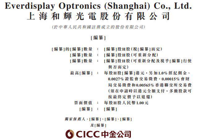 | [编纂]的[编纂]數量:[编纂]股H股(視[编纂]而定) | [编纂]數量 : | [编纂]股H股(可更新分配) | | --- | --- | --- | | [編纂]股H股(可重新分配及視乎[編纂]行使 | [编纂]數量 : | 與否而定) | | 最高[编纂] : | 每股H股[编纂]港元,另加1.0%經紀佣金、 | 0.0027% 設監會交易徵費、0.00015% 貿財 | | 局交易微費和0.00565%香港聯交所交易費 | (須在申請時以港元全額支付,多繳股款可 | | | 按最終定價予以退還) | 票面價值 : | 每股H股人民幣1.00元 | | [编纂] : [编纂] | | | 智通财经APP获悉,据港交所10月24日披露,上海和辉光电股份有限公司(688538.SH)向港交所主板提 交上市申请书,中金公司为独家保荐人。该公司曾于2025年4月23日向港交所递交过上市申请。 和辉光电与全球领先的中国智能终端设备提供商保持了十多年的合作关系。该公司的AMOLED半导体 显示面板已服务荣耀及传音等领先的消费电子品牌以及中国五大车企中的两家。 和辉光电的产品供应能力覆盖多种应用领域,包括四个 ...