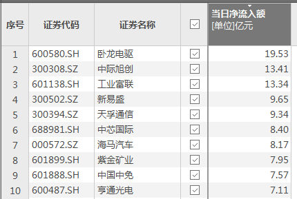 上证报中国证券网讯(记者 李雨琪)Choice数据显示,12月22日,资金净流入额前十的个股为卧龙电 驱、中际旭创、工业富联、新易盛、天孚通信、中芯国际、海马汽车、紫金矿业、中国中免、亨通光 电。其中,中际旭创、新易盛、天孚通信、亨通光电等均属于CPO概念股。 | 陸号 | 证券代码 | 证券名称 | V | 当日净流入额 [单位]亿元 | | | --- | --- | --- | --- | --- | --- | | 1 | 600580.SH | 卧龙申驭 | V | | 19.53 | | 2 | 300308.SZ | 中际旭创 | V | | 13.41 | | 3 | 601138.SH | 工业富联 | V | | 13.34 | | র | 300502.SZ | 新易盛 | V | | 9.65 | | 5 | 300394.SZ | 天孚通信 | V | | 9.34 | | 6 | 688981 SH | 中心国际 | V | | 8.40 | | 7 | 000572.SZ | 海马汽车 | V | | 8.17 | | 8 | 601899.SH | 常全矿业 | > | | 7 ...
