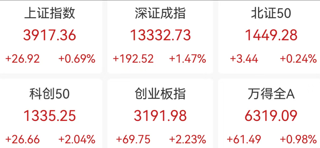 | 上证指数 | 深证成指 | 北证5C | | --- | --- | --- | | 3917.36 | 13332.73 | 1449.2 | | +26.92 +0.69% +192.52 +1.47% +3.45 +0 | | | | 科创20 | 创业板指 | 万得全/ | | 1335.25 | 3191.98 | 6319.0 | | +26.66 +2.04% +69.75 +2.23% +61.49 +0 | | | | 沪深300 | 中证500 | 中证A5( | | 4611.62 | 7255.66 | 5580.2 | | +43.45 +0.95% +86.11 +1.20% +64.11 +1 | | | | 中证1000 | 中证2000 | 中证红和 | | 7408.35 | 3137.92 | 5458.2 | | +78.54 +1.07% +26.76 +0.86% -25.12 -0 | | | A股主要指数今日高开高走,截至收盘,沪指涨0.69%报3917点,深证成指涨1.47%,创业板指涨2.23%,科创50指数涨2.04%。全市场成交额1.88万亿元,较 ...