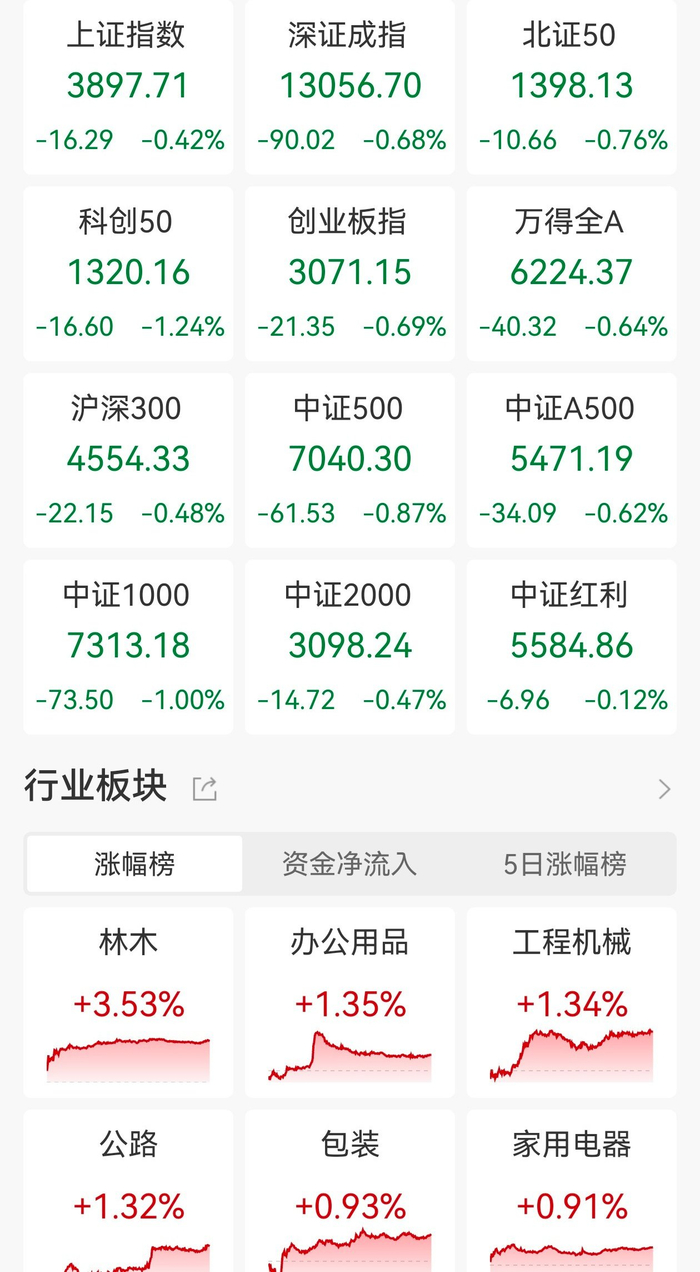 | 上证指数 | 深证成指 | 北证50 | | --- | --- | --- | | 3897.71 | 13056.70 | 1398.13 | | -16.29 -0.42% -90.02 -0.68% -10.66 -0.76% | | | | 科创50 | 创业板指 | 万得全A | | 1320.16 | 3071.15 | 6224.37 | | -16.60 -1.24% -21.35 -0.69% -40.32 -0.64% | | | | 沪深300 | 中证500 | 中证A500 | | 4554.33 | 7040.30 | 5471.19 | | -22.15 -0.48% -61.53 -0.87% -34.09 -0.62% | | | | 中证1000 | 中证2000 | 中证红利 | | 7313.18 | 3098.24 | 5584.86 | | -73.50 -1.00% -14.72 -0.47% -6.96 -0.12% | | | 格隆汇12月2日|A股三大指数今日集体下跌,截至收盘,沪指跌0.42%报3897点,深证成指跌0.68%, 创业板指跌0.69% ...