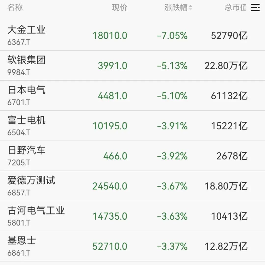 日韩股市及主要公司表现 - 韩国综合指数开盘下跌超过2% [1] - 日经225指数早盘下探后盘中翻红 [1] - 多数芯片股下跌,受AMD令人失望的业绩预期影响,跟随隔夜美国科技股走低 [1] 韩国芯片巨头股价变动 - 三星电子开盘下跌超过4% [1] - SK海力士开盘下跌超过4% [1] 软银集团相关动态 - 软银集团股价下跌超过5% [1] - Arm CEO表示,根据与孙正义的沟通,软银目前无意出售Arm股份 [1] - Arm预计数据中心业务将成为未来数年内最大的一项业务,其规模将超过移动业务 [1] - 软银旗下全资子公司SAIMEMORY已与英特尔签署协议,双方将携手推进下一代高容量、高带宽、低功耗内存技术Z-Angle Memory(ZAM)的商业化 [1] 日本市场其他领跌公司 - 大金工业股价下跌7.05%,总市值52790亿日元 [1][2] - 日本电气股价下跌5.10%,总市值61132亿日元 [1][2] - 爱德万测试股价下跌3.67%,总市值18.80万亿日元 [1][2] - 富士电机股价下跌3.91%,总市值15221亿日元 [2] - 日野汽车股价下跌3.92%,总市值2678亿日元 [2] - 古河电气工业股价下跌3.63%,总市值10413亿日元 [2] - 基恩士股价下跌3.37%,总市值12.82万亿日元 [2]