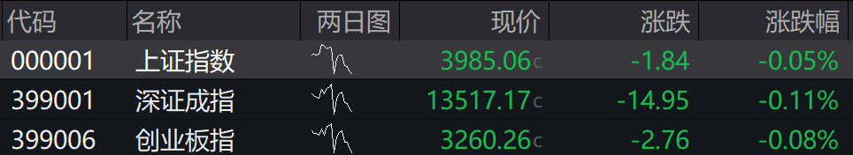 09:25 A股开盘丨三大指数集体低开 沪指跌0.05%,深证成指跌0.11%,创业板指跌0.08%。 | 代码 | 名称 | 两日图 | 现价 | 涨跌 | 涨跌幅 | | --- | --- | --- | --- | --- | --- | | 000001 | 上证指数 | 7 | 3985.06c | -1.84 | -0.05% | | 399001 | 深证成指 | wh | 13517.17c | -14.95 | -0.11% | | 399006 | 创业板指 | WN | 3260.26c | -2.76 | -0.08% | 盘面上,存储芯片、培育钻石、光伏、新能源车题材走弱;免税店、锂电池、黄金概念股走强。 09:46 富时中国A50指数期货跌幅扩大至1%。 09:43 创业板指跌幅扩大至1%,上证指数跌0.42%,深证成指跌0.46%,存储芯片、F5G概念、光通信模块等板块跌幅居前,两市下跌个 股超1700只。 09:38 恒生科技指数跌超1%,比亚迪股份跌超5%领跌成分股。 09:35 免税店板块盘初拉升,海汽集团触及涨停,凯撒旅业、海南发展、中国中免、东百集团跟涨。 09:27 ...