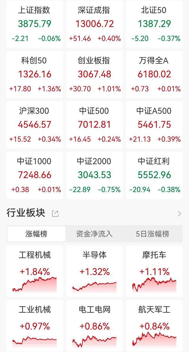 市场整体表现 - A股三大指数涨跌不一,沪指收报3875点,下跌0.06%,深证成指上涨0.40%,创业板指上涨1.01% [1] - 全市场成交额为1.56万亿元,较前一交易日缩量1219亿元 [1] - 市场呈现普跌格局,超过3800只个股下跌 [1] 主要指数详情 - 上证指数收于3875.79点,下跌2.21点,跌幅0.06% [2] - 深证成指收于13006.72点,上涨51.46点,涨幅0.40% [2] - 创业板指收于3067.48点,上涨30.70点,涨幅1.01% [2] - 科创50指数表现强势,收于1326.16点,上涨17.80点,涨幅1.36% [2] - 沪深300指数收于4546.57点,上涨15.52点,涨幅0.34% [2] - 中证500指数收于7012.81点,上涨16.45点,涨幅0.24% [2] - 中证1000指数微涨0.01%,收于7248.66点 [2] - 中证2000指数表现较弱,收于3043.53点,下跌22.89点,跌幅0.75% [2] 行业与板块表现 - 机器人板块爆发,巨轮智能、日发精机及恒尔达等多股涨停 [4] - 卫星互联网板块走高,和而泰、中国卫星等多股涨停 [4] - 大飞机板块拉升,航天环宇涨停 [4] - 工业母机、F5G、商业航天及SPD概念等板块涨幅居前 [4] - 船舶制造板块下挫,江龙船艇跌逾11% [4] - 海南板块走低,罗牛山跌停 [4] - 乳业股走弱,品渥食品领跌 [4] - 旅游酒店板块震荡下行,同庆楼跌停 [4] - 培育钻石、预制菜概念及有机硅等板块跌幅居前 [4]