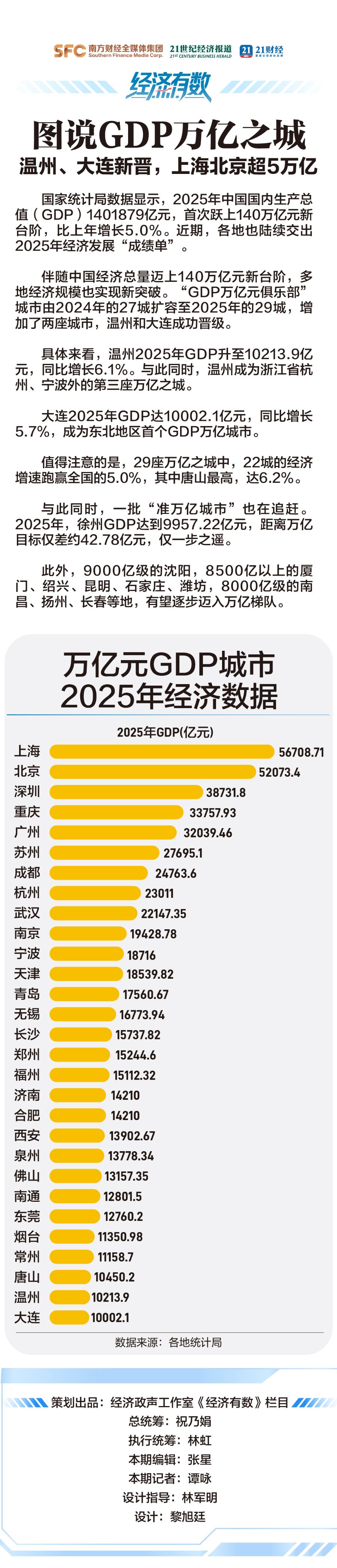 大连市2025年经济表现 - 2025年地区生产总值达到10002.1亿元,按不变价格计算同比增长5.7%,成为东北地区首个GDP突破万亿元的城市 [2] - 第一产业增加值665.4亿元,同比增长3.6%;第二产业增加值3532.5亿元,同比增长7.7%;第三产业增加值5804.2亿元,同比增长4.8% [2] - 全年规上工业增加值同比增长11.7%,增速比上年同期提高4.1个百分点 [2] - 重点行业中,装备制造业增加值增长15.4%,其中铁路船舶行业增长57.5%,汽车行业增长19.5%;石化工业增加值增长8.9%;高技术制造业增长13.9%,其中计算机及办公设备制造业增长78.2%,医药制造业增长30.9% [2] - 主要产品产量方面,化学药品原药增长26.1%,集成电路圆片增长19.1%,液晶显示屏增长3.0% [2] 温州市2025年经济表现 - 2025年地区生产总值突破万亿元,成为新晋“GDP万亿俱乐部”城市 [3] - 分析认为,温州拥有遍布全球的温州人网络,带来了丰富的资金和信息资源 [3] - 近年来,温州在传统产业焕新和新兴产业培育方面投入巨大,并重视科技发展与高校建设以支撑产业发展 [3] - 浙江省高铁等交通基础设施的完善,使得杭州的科教资源能更有效地服务温州产业提升 [3][4] 中国“GDP万亿城市”格局更新 - 随着大连和温州加入,中国GDP万亿城市总数增至29个 [4] - 这29个城市包括4个直辖市、11个省会城市、4个计划单列市和10个普通地级市 [4] - 从经济总量看,上海和北京超过5万亿元;深圳、重庆、广州在3万亿元以上;苏州、成都、杭州、武汉超过2万亿元 [4] 主要城市2025年经济数据 - 上海市2025年地区生产总值为56708.71亿元,同比增长5.4%,高于全国水平(5%),经济总量位居全球城市第五位 [4] - 北京市2025年地区生产总值为52073.4亿元,同比增长5.4%,成为全国第二个GDP5万亿城市 [5] - 北京市信息传输、软件和信息技术服务业增加值12192.4亿元,增长11.0%;金融业增加值8668.2亿元,增长8.7%;这两个行业对全市经济增长贡献率超过7成 [5] - 苏州市2025年地区生产总值预计达到2.77万亿元,规上工业总产值达4.9万亿元;并将规上工业总产值迈上5万亿元台阶设为2026年主要预期目标之一 [5]