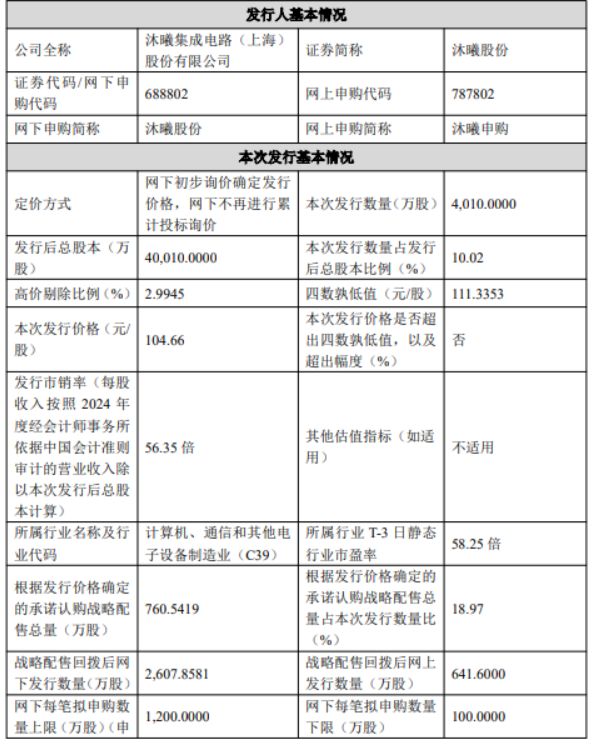 发行定价与募资情况 - 公司确定首次公开发行股票并在科创板上市的发行价格为104.66元/股 [1] - 本次发行新股数量为4010万股,占发行后总股本40,010万股的10.02% [2] - 按发行价计算,预计募集资金总额为41.97亿元,扣除发行费用2.98亿元后,预计募集资金净额为38.99亿元,与募投项目预计使用募集资金39亿元基本一致 [1] 估值与市场指标 - 本次发行价格104.66元/股未超出“四数孰低值”111.3353元/股 [2] - 按2024年度经审计的营业收入及发行后总股本计算,发行市销率为56.35倍 [2] - 公司所属行业为计算机、通信和其他电子设备制造业,其T-3日静态行业市盈率为58.25倍 [2] 发行结构安排 - 战略投资者承诺认购总量为760.5419万股,占本次发行数量的18.97% [2] - 战略配售回拨后,网下发行数量为2607.8581万股,网上发行数量为641.6000万股 [2] - 网上申购每笔拟申购数量上限为0.6000万股,网下每笔拟申购数量下限为100.0000万股 [2][3] 公司基本情况 - 公司全称为沐曦集成电路(上海)股份有限公司,证券简称为沐曦股份,证券代码为688802 [2] - 公司是国内高性能通用GPU产品的主要领军企业之一,致力于自主研发全栈高性能GPU芯片及计算平台 [3] - 公司主营业务是研发、设计和销售应用于人工智能训练和推理、通用计算与图形渲染领域的全栈GPU产品,并提供配套软件栈与计算平台 [3] 发行时间安排 - 网下和网上申购日均为2025年12月5日 [3] - 网下和网上缴款截止日均为2025年12月9日 [3]