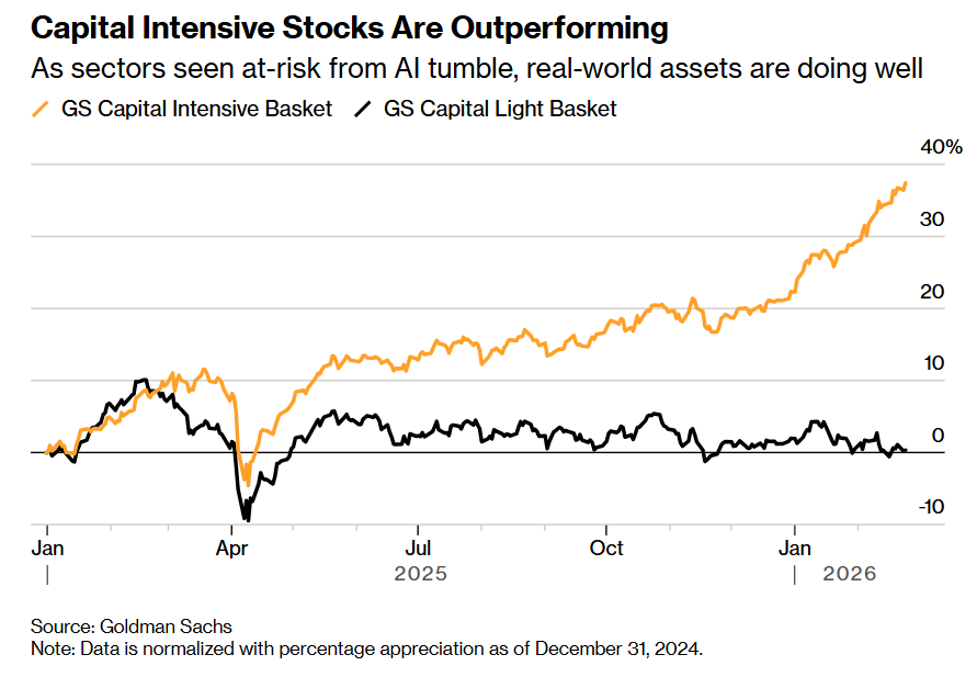 文章核心观点 - 投资者正转向拥有有形生产资产的公司股票以规避AI颠覆风险 这类重资产低淘汰风险公司的表现显著跑赢轻资产公司 高盛将这一市场结构性变化称为“HALO效应” [1] - 市场正在奖励复制成本高且不易受技术快速淘汰影响的资产 如产能 网络 基础设施及工程复杂性 [2] - 对AI颠覆商业模式的广泛担忧引发了跨行业抛售 甚至波及表面不易受冲击的行业 [2] - 争夺AI领导地位的竞争正促使大型科技公司从轻资产模式转变为资本密集型模式 并大幅增加资本开支 [2][3] - 较高的实际收益率 地缘政治驱动的财政支出与制造业支持政策 以及盈利动能的转变 共同助推资金流向资本密集型行业 [3] 市场表现与资金流向 - 自2025年初以来 高盛构建的资本密集型股票组合表现较依赖人力或数字资本的轻资产股票组合高出约35% [1] - 投资者偏好转向具备“HALO效应”的股票 即资产沉重 淘汰风险低的公司 主要分布在公用事业 基础资源和能源等行业 [1] - 摩根士丹利指出 截至2025年底 欧洲的长期资金已开始降低对面临AI颠覆风险股票的配置比例 [3] 行业与公司案例 - 高盛欧洲资本密集型股票组合包括ASML Holding NV 赛峰 路威酩轩 液化空气以及空中客车等公司 [2] - 高盛欧洲轻资产股票组合包括欧莱雅 Adyen DSV和西门子医疗等公司 [2] - 对AI颠覆的担忧席卷了从软件到资产管理等多个行业 导致此前被视为稳健赢家的股票大幅下跌 [2] - 亚马逊 微软 Alphabet Meta Platforms以及甲骨文等公司预计在2023年至2026年间为建设AI基础设施投入约1.5万亿美元 而2022年之前的累计投资规模约为6000亿美元 [3] 驱动因素与盈利趋势 - 较高的实际收益率以及推动财政支出增加和制造业支持的地缘政治因素 助推资金流向资本密集型行业 [3] - 盈利动能正转向有利于资本密集型公司 目前市场一致预期的每股收益增长率和股本回报率已高于轻资产公司 [3]