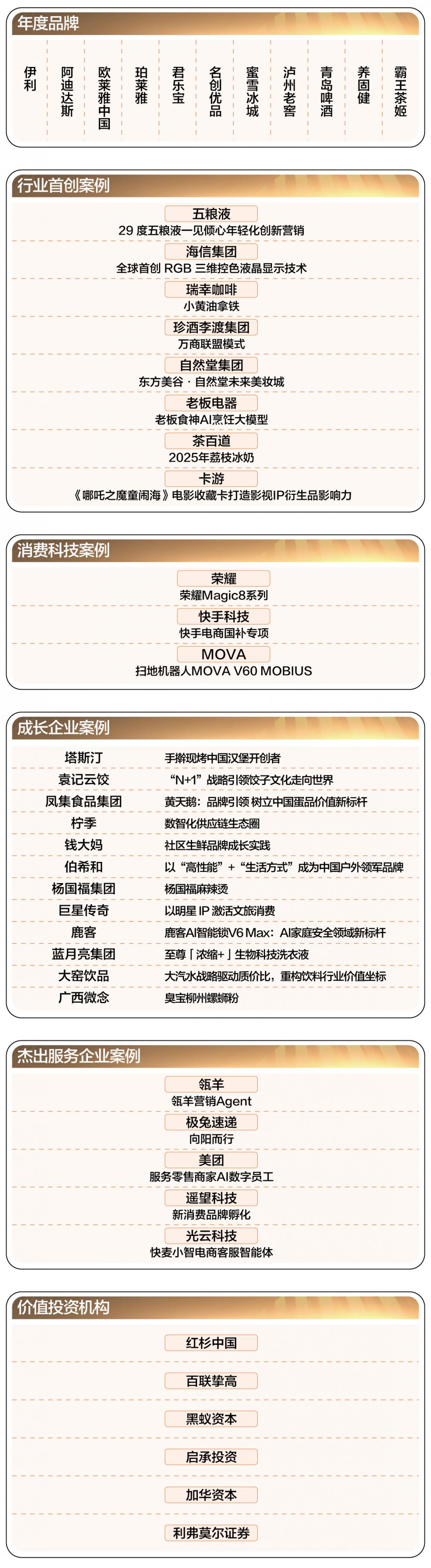 12月17日,由21世纪经济报道举办的"2025新消费大会"盛大启幕,会议汇聚了来自众多消费品牌、知名投资机构和券商,以及平台等各领域上 百名嘉宾。 消费科技案例 荣耀 荣耀Magic8系列 快手科技 快手电商国补专项 MOVA 扫地机器人MOVA V60 MOBIUS | 成长企业案例 | | | --- | --- | | 塔斯汀 | 手辩现烤中国汉堡开创者 | | 袁记云饺 | "N+1"战略引领饺子文化走向世界 | | 凤集食品集团 | 黄天鹅:品牌引领 树立中国蛋品价值新标杆 | | 柠季 | 数智化供应链生态圈 | | 钱大妈 | 社区生鲜品牌成长实践 | | 伯希和 | 以"高性能"+"生活方式"成为中国户外领军品牌 | | 杨国福集团 | 杨国福麻辣烫 | | 巨星传奇 | 以明星 IP 激活文旅消费 | | 鹿客 | 鹿客Al智能锁V6 Max: Al家庭安全领域新标杆 | | 蓝月亮集团 | 至尊 浓缩+ 生物科技洗衣液 | | 大窑饮品 | 大汽水战略驱动质价比,重构饮料行业价值坐标 | | 西微念 | 臭宝柳州螺飾粉 | 杰出服务企业案例 领主 领羊营销Agent 极兔速递 本届大会以 ...