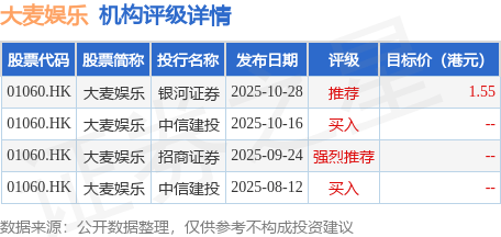 摩根士丹利发布研报称,大麦娱乐(01060.HK)发盈利预告,初步估算9月底止上半财年净利润多于5亿元 人民币,高于该行预测的4.97亿元人民币。大摩表示,由于大麦娱乐的IP扩展,加上在产品零售方面的 新业务措施,相信公司将有更高增长率。该行预计公司总收入同比增长27%,其中IP业务增90%,而线 下娱乐业绩则升13%。该行又予公司"增持"评级,目标价1.2港元。 截至2025年11月7日收盘,大麦娱乐(01060.HK)报收于0.94港元,与上一交易日持平,成交量3.33亿股, 成交额3.21亿港元。投行对该股的评级以买入为主,近90天内共有2家投行给出买入评级,近90天的目 标均价为1.44港元。中金公司最新一份研报给予大麦娱乐跑赢行业(OUTPERFORM)评级,目标价1.32港 元。 | 指标 | 大麦娱乐 | 文化传媒 行业平均 | 行业排名 | | --- | --- | --- | --- | | ROE | 0.85% | -16.18% | 26 72 | | 港股流通市值 | 280.83 乙 | 71.76亿 | 4 72 | | 营业收入 | 54.71亿 | 16.89 乙 | 8 ...