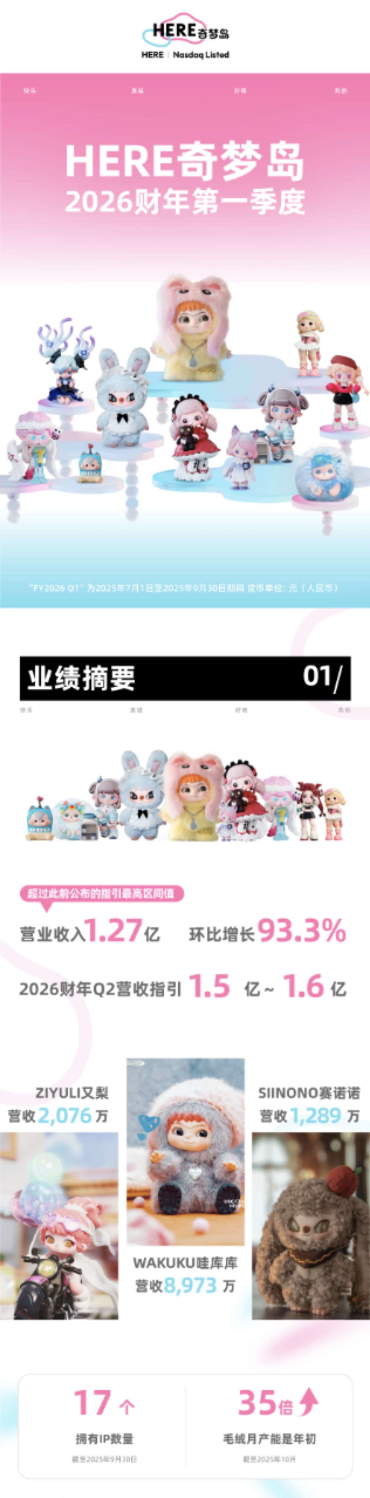核心观点 - 公司完成业务重组并全面聚焦潮玩业务后,2026财年第一季度业绩实现显著环比增长,核心经营指标全面向好,标志着公司已进入战略落地加速期 [1] 财务业绩 - 2026财年第一季度(2025年7月1日至2025年9月30日)潮玩业务总营收为1.271亿元,环比激增93.3%,超过此前公布的1亿至1.1亿元业绩指引区间上限 [9][13][16] - 公司给出2026财年第二季度营收指引为1.5亿元至1.6亿元 [9][16] 业务运营与IP表现 - 公司已完成非潮玩业务的剥离,将所有资源聚焦于IP潮玩市场 [16] - 截至2025年9月30日,公司拥有11个自有知识产权IP(如WAKUKU哇库库、ZIYULI又梨)、4个独家授权IP(如SIINONO赛诺诺)和2个非独家授权IP [16] - 明星IP矩阵表现强劲:WAKUKU哇库库营收8,973万元,ZIYULI又梨营收2,076万元,SIINONO赛诺诺自7月中下旬推出后营收1,289万元 [13][16] - 供应链效率取得突破:2025年8月毛绒盲盒单月产量突破100万件,较年初增长超20倍;10月份月产量跃升至1月份的35倍 [17] 品牌建设与跨界合作 - 公司成为中国网球公开赛历史上首个官方潮玩品牌合作伙伴,验证了“潮玩+顶级体育赛事”模式 [17] - 公司两款潮玩作品在2025“北京礼物”全球文创大赛中获奖 [17] - 公司与北京台签署战略合作协议,共同推出城市主题潮玩、节日文化礼品 [17] - 公司与香港紫荆文化集团旗下紫荆杂志社签署战略合作协议,将联合推出WAKUKU香港城市限定款潮玩产品 [17] - 公司深度参与了北京时装周和第38届中国电影金鸡奖,提升品牌调性 [18] 渠道拓展与市场布局 - 线上渠道:2026财年第一季度线上电商GMV突破4,460万元;抖音与小红书平台内容总播放量分别达6.79亿次和1.71亿次;抖音旗舰店GMV环比增长97.2% [19] - 线下渠道:线下网络已覆盖上百个重点渠道,并持续在一线城市顶级商圈布局直营及主题快闪店;12月初在上海K11和深圳壹方城落地“双旦主题快闪”;12月下旬至明年1月初将在北京、重庆开设4个品牌直营店铺 [19] - 国际市场:在北美TikTok Shop平台成为收藏品类目头部玩家;产品通过分销网络已进入近20个国家,包括北美、欧洲、东南亚及中东等地区 [19] 管理层评论 - 公司董事长表示,业绩增长印证了“聚焦潮玩主航道”战略的正确性与前瞻性,“IP研发+全渠道拓展”双引擎战略正持续释放增长势能,公司已构建把握行业增长机遇的核心能力 [20]