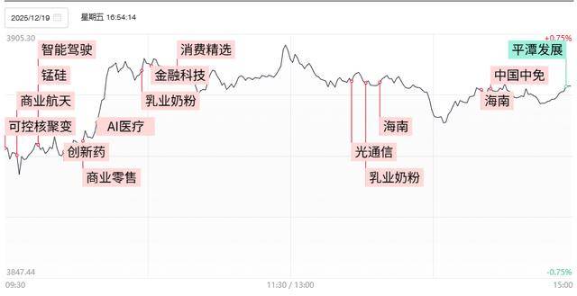 具体来看,沪指盘中维持窄幅震荡上扬态势,创业板指、科创50指数大幅下挫。截至收盘,沪指涨 0.16%报3876.37点,深证成指跌1.29%,创业板指跌2.17%,沪深北三市合计成交16770亿元,较此前一 日减少1575亿元。 全A超2800股飘红,银行、保险板块拉升,建设银行、工商银行、农业银行等涨超2%;AI医疗概念崛 起,嘉和美康、华人健康等涨停;商业航天概念再度爆发,西测测试涨超12%,盘中续创新高;顺灏股 份(002565)15日斩获8板;IP经济概念拉升,德艺文创、博纳影业等涨停;零售概念热度不减,百大 集团斩获6连板。此外,今日登陆深市主板的元创股份收盘涨171.6%报67.23元/股,盘中一度大涨 219.2%最高攀升至79元/股,以盘中最高价计算,该股单签最高盈利达2.7万元。 银行板块上扬 银行板块盘中发力上扬,截至收盘,上海银行、渝农商行涨超3%,宁波银行、建设银行、工商银行、 农业银行等均涨逾2%。 12月18日,A股主要股指走势现明显分化,沪指小幅走高,创业板指大幅回落;港股方面,恒生指数尾 盘翻红。 商业航天概念活跃 中金指出,作为金融基础设施,银行已进入高质量发展阶段,过去一两 ...