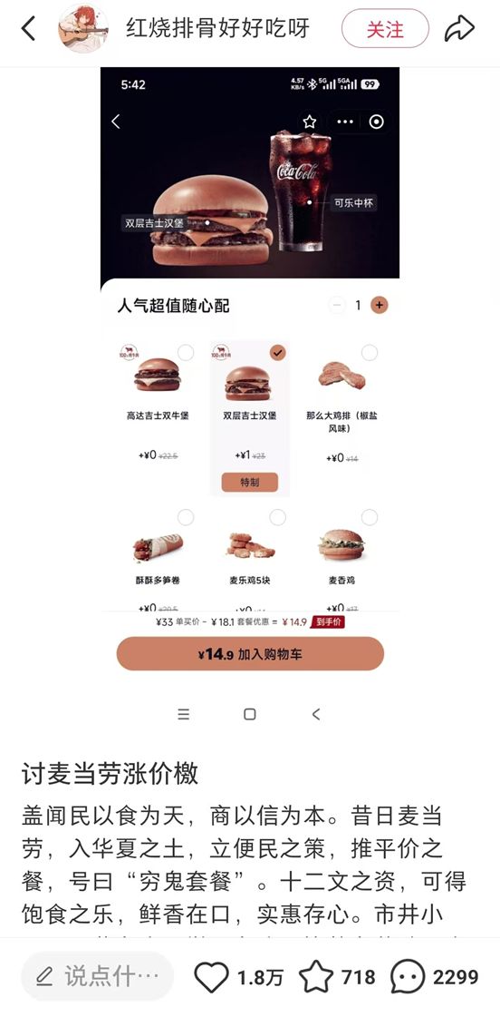 文/戚梦颖 麦当劳又又又涨价了! 麦当劳宣布,2025年12月15日起,部分餐品的价格增加0.5到1元。有着"穷鬼套餐"之称的"1+1随心 配"也因这次调价影响,部分搭配涨价至14.9元。 这次调价让不少消费者感到失望和不满,有网友表示将不再拥护"麦门",甚至有网友洋洋洒洒写下一 篇"讨麦当劳涨价檄"。 事实上,在近5年的时间里,麦当劳被媒体报道过的涨价就有5次。但从业绩数据上来看,"麦门信徒"们 并没有如他们所言背弃"麦门",反而让麦当劳愈加壮大。根据麦当劳方面的数据,到2028年,麦当劳在 中国的门店将超过1万家。 5年涨价5次,单品年均涨约0.5—1元 2019年3月,麦当劳首次推出"1+1随心配"套餐,消费者可以从红区、白区各选一个餐品,套餐总计12 元。 在动辄一个汉堡就要10多元的麦当劳,花费12元就可以吃到两个单品,因此"1+1随心配"就被网友们调 侃为"穷鬼套餐"。 但在2021年年末,"随心配1+1"就迎来第一次调价,由12元涨价至12.9元;2023年1月,"随心配1+1"又 从12.9元调整至13.9元;如今,"随心配1+1"中的部分搭配涨到了14.9元。 从2019年到2025年,"随 ...