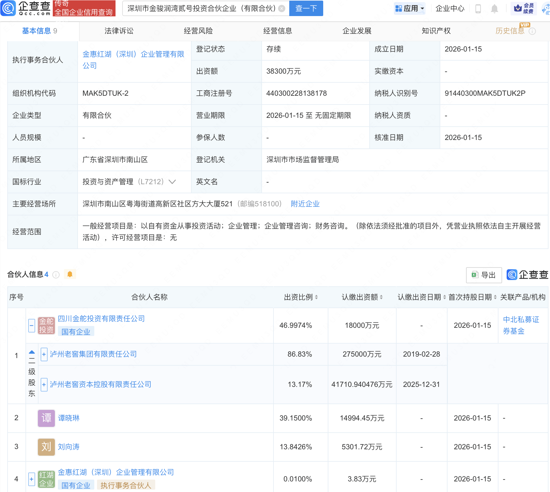 泸州老窖等新设投资合伙企业,出资额3.83亿