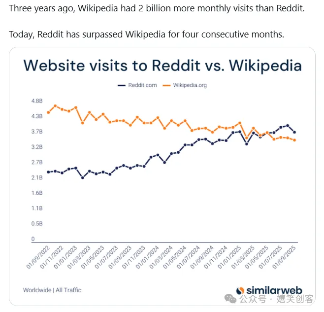 本文来自:嬉笑创客,原文标题:《Wikipedia在AI时代的衰落》,题图来自:视觉中国 挺有意思的图,看来wikipediad等百科全书最容易被GPT等LLM AI替代,Reddit这种论坛社区依然顽强生 长,甚至因为能为大模型源源不断提供真实语料而价值凸显。 按这样推算的话,小红书的价值也会比知乎更大很多?反正Stackoverflow已经岌岌可危了。 另外人对真实互动的需求一直存在,很多AI陪伴只是退而求其次的替代品,我也怀疑厌倦上来是很快的。 果然玩东西的最高境界是和无尽可能性的人玩(生物人、社会人、会突变不可预料,还会演变的人)。想 起来游戏运营的那个原则,99%的玩家免费不重要,最重要的是让氪金的1%玩家感受到是在玩剩下的其他 所有人。 所以,BTW,游戏玩家真的习惯长期用逗逗游戏伙伴的到底有多少?月活真有几百万?不是说好的真玩家 从来不看说明书和教程吗? ...