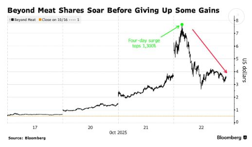 曾备受华尔街冷落的人造肉公司Beyond Meat,正以一种极端的方式重返市场焦点。在一场由散户投资者推动、让人联想到过往"Meme股"狂热的 交易中,该公司股价出现爆炸式上涨,上演了教科书式的"逼空"行情。 惊人的涨势!"逼空"行情的多重催化剂 Beyond Meat的股价从上周四收盘时的52美分开始启动。周五,涨势初现端倪,并在本周一加速。据Business Insider报道,一位名为Demitri Semenikhin的交易员在社交媒体上大力宣传该股票,吸引了市场的关注。 行情在本周二进入白热化。当天,Beyond Meat的股票换手额高达约59亿美元,相当于其收盘时市值的4.2倍。而在上周四,该公司的市值还不足 4000万美元。这轮涨势也带动了其他Meme股的异动,例如甜甜圈连锁店Krispy Kreme Inc.的股价在周三盘前上涨了26%。 此轮上涨被普遍认为是一场典型的"逼空"(short squeeze),即股价的快速上涨迫使做空者买入股票以回补其亏损头寸,从而进一步推高股价。 而引爆行情的催化剂是多方面的。 首先是极高的空头仓位。截至9月底,Beyond Meat约64%的可供交易股份已被 ...
